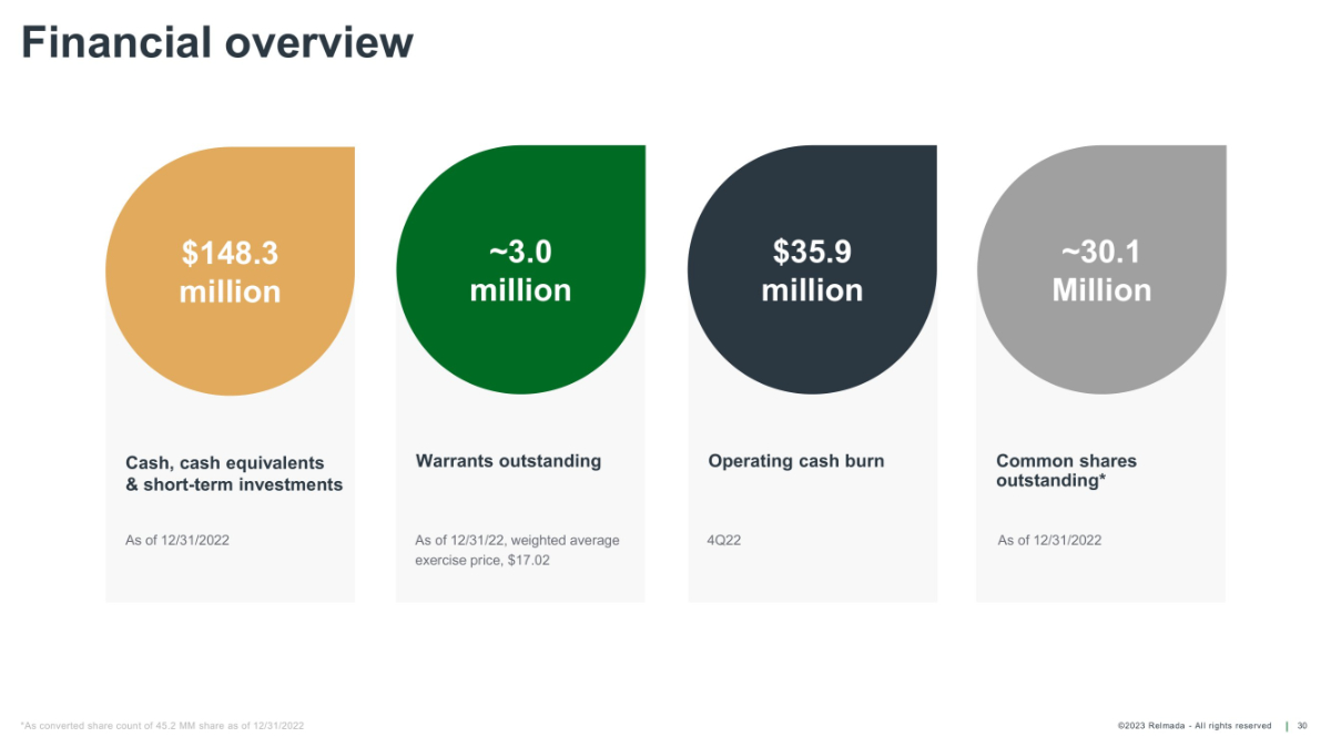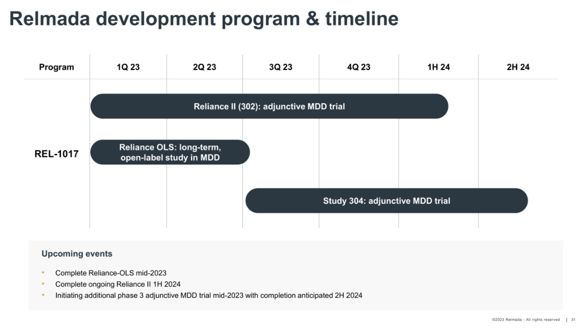 ©2023 Relmada - All rights reserved Warrants outstanding Operating cash burn Common shares outstanding* Financial overview 30 Cash, cash equivalents & short - term investments $148.3 million ~3.0 million $35.9 million ~30.1 Million As of 12/31/22, weighted average exercise price, $17.02 4Q22 As of 12/31/2022 As of 12/31/2022 *As converted share count of 45.2 MM share as of 12/31/2022