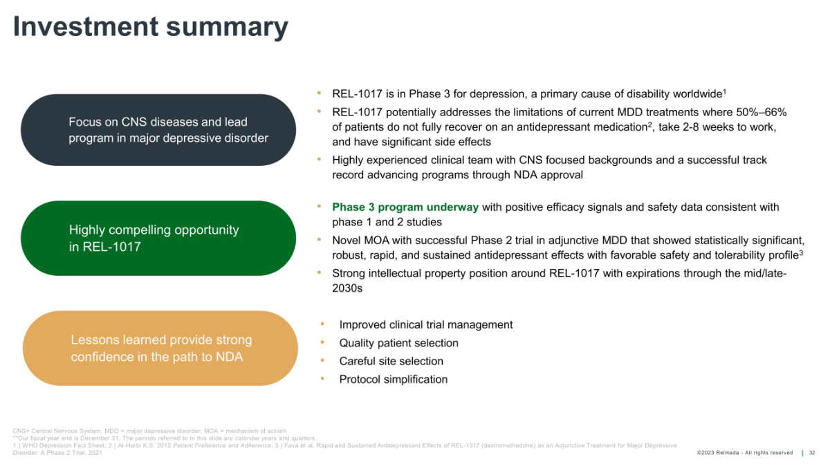 ©2023 Relmada - All rights reserved Relmada development program & timeline 31 Program 1Q 23 2Q 23 3Q 23 4Q 23 1H 24 2H 24 REL - 1017 Upcoming events • Complete Reliance - OLS mid - 2023 • Complete ongoing Reliance II 1H 2024 • Initiating additional phase 3 adjunctive MDD trial mid - 2023 with completion anticipated 2H 2024 Reliance II (302): adjunctive MDD trial Reliance OLS: long - term, open - label study in MDD Study 304: adjunctive MDD trial