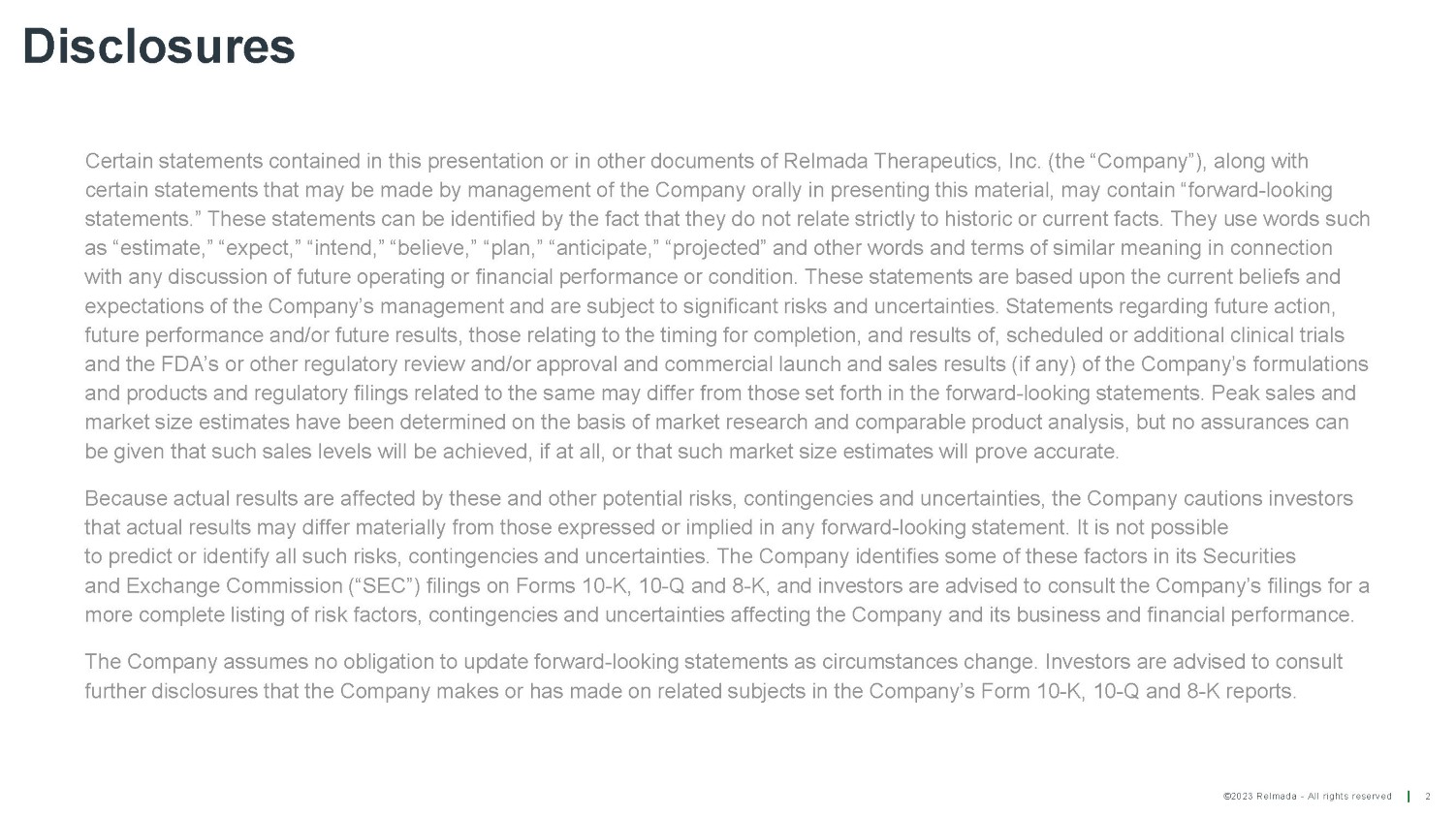©2023 Relmada - All rights reserved Disclosures 2 Certain statements contained in this presentation or in other documents of Relmada Therapeutics, Inc. (the “Company”), along with certain statements that may be made by management of the Company orally in presenting this material, may contain “forward - looking statements.” These statements can be identified by the fact that they do not relate strictly to historic or current facts. They use words such as “estimate,” “expect,” “intend,” “believe,” “plan,” “anticipate,” “projected” and other words and terms of similar meaning in connection with any discussion of future operating or financial performance or condition. These statements are based upon the current beliefs and expectations of the Company’s management and are subject to significant risks and uncertainties. Statements regarding future action, future performance and/or future results, those relating to the timing for completion, and results of, scheduled or additional clinical trials and the FDA’s or other regulatory review and/or approval and commercial launch and sales results (if any) of the Company’s formulations and products and regulatory filings related to the same may differ from those set forth in the forward - looking statements. Peak sales and market size estimates have been determined on the basis of market research and comparable product analysis, but no assurances can be given that such sales levels will be achieved, if at all, or that such market size estimates will prove accurate. Because actual results are affected by these and other potential risks, contingencies and uncertainties, the Company cautions investors that actual results may differ materially from those expressed or implied in any forward - looking statement. It is not possible to predict or identify all such risks, contingencies and uncertainties. The Company identifies some of these factors in its Securities and Exchange Commission (“SEC”) filings on Forms 10 - K, 10 - Q and 8 - K, and investors are advised to consult the Company’s filings for a more complete listing of risk factors, contingencies and uncertainties affecting the Company and its business and financial performance. The Company assumes no obligation to update forward - looking statements as circumstances change. Investors are advised to consult further disclosures that the Company makes or has made on related subjects in the Company’s Form 10 - K, 10 - Q and 8 - K reports.