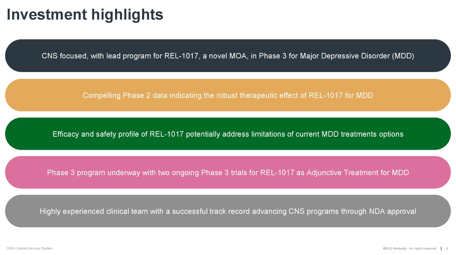 ©2023 Relmada - All rights reserved Highly experienced clinical team with a successful track record advancing CNS programs through NDA approval Phase 3 program underway with two ongoing Phase 3 trials for REL - 1017 as Adjunctive Treatment for MDD Efficacy and safety profile of REL - 1017 potentially address limitations of current MDD treatments options Compelling Phase 2 data indicating the robust therapeutic effect of REL - 1017 for MDD Investment highlights 3 CNS= Central Nervous System CNS focused, with lead program for REL - 1017, a novel MOA, in Phase 3 for Major Depressive Disorder (MDD)