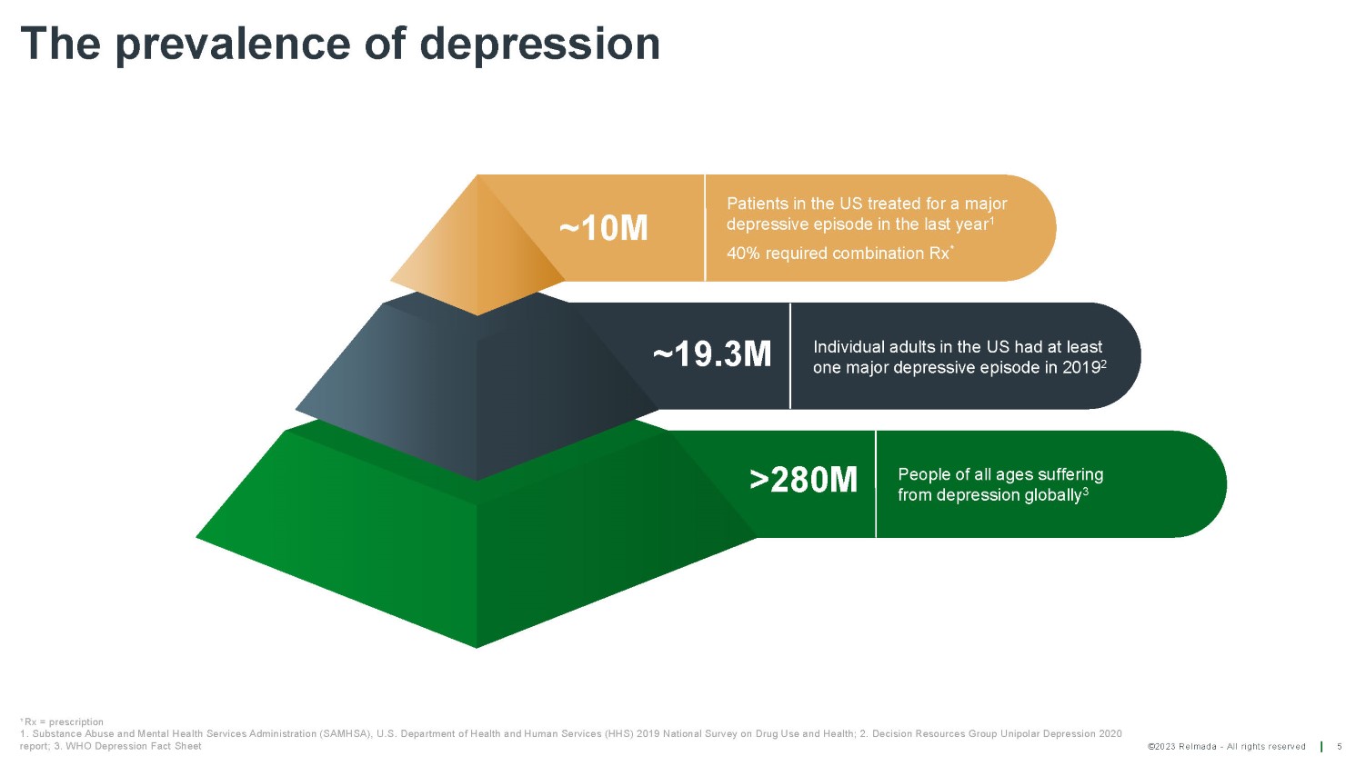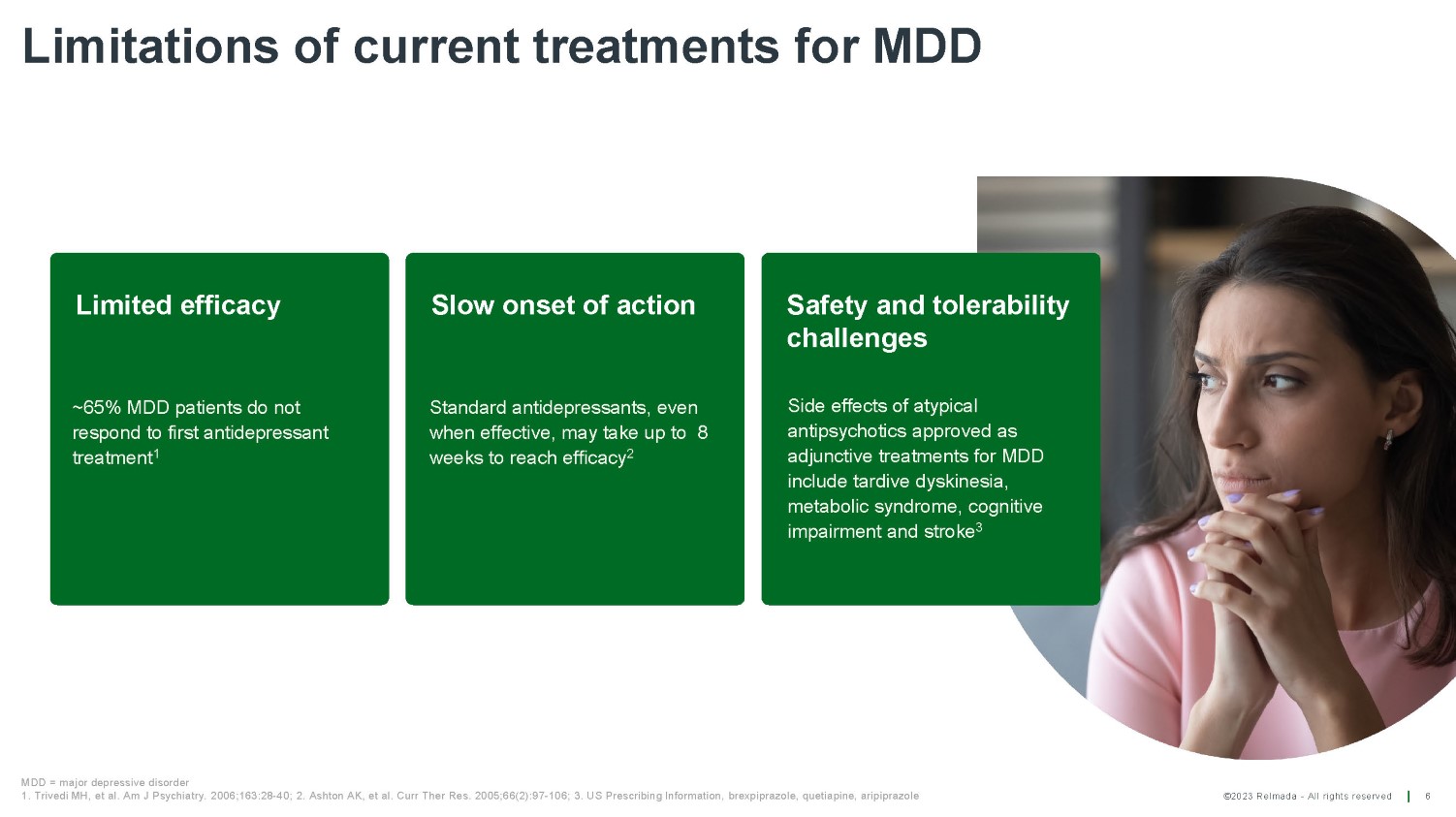 ©2023 Relmada - All rights reserved The prevalence of depression 5 ~10M Patients in the US treated for a major depressive episode in the last year 1 40% required combination Rx * ~19.3M Individual adults in the US had at least one major depressive episode in 2019 2 >280M People of all ages suffering from depression globally 3 *Rx = prescription 1. Substance Abuse and Mental Health Services Administration (SAMHSA), U.S. Department of Health and Human Services (HHS) 2019 National Survey on Drug Use and Health; 2. Decision Resources Group Unipolar Depression 2020 report; 3. WHO Depression Fact Sheet