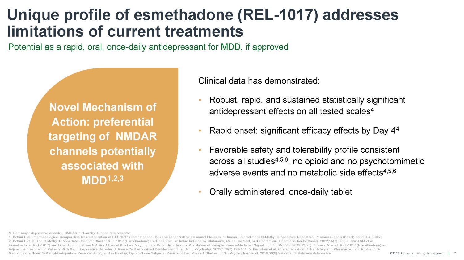 ©2023 Relmada - All rights reserved Unique profile of esmethadone (REL - 1017) addresses limitations of current treatments Potential as a rapid, oral, once - daily antidepressant for MDD, if approved 7 MDD = major depressive disorder; NMDAR = N - methyl - D - aspartate receptor 1. Bettini E al. Pharmacological Comparative Characterization of REL - 1017 (Esmethadone - HCl) and Other NMDAR Channel Blockers in Human Heterodimeric N - Methyl - D - Aspartate Receptors. Pharmaceuticals (Basel). 2022;15(8):997; 2. Bettini E et al. The N - Methyl - D - Aspartate Receptor Blocker REL - 1017 (Esmethadone) Reduces Calcium Influx Induced by Glutamate, Quinolinic Acid, and Gentamicin. Pharmaceuticals (Basel). 2022;15(7):882; 3. Stahl SM et al. Esmethadone (REL - 1017) and Other Uncompetitive NMDAR Channel Blockers May Improve Mood Disorders via Modulation of Synaptic Kinase - Mediated Signaling. Int J Mol Sci. 2022;23(20); 4. Fava M et al. REL - 1017 (Esmethadone) as Adjunctive Treatment in Patients With Major Depressive Disorder: A Phase 2a Randomized Double - Blind Trial. Am J Psychiatry. 2022;179(2):122 - 131; 5. Bernstein et al. Characterization of the Safety and Pharmacokinetic Profile of D - Methadone, a Novel N - Methyl - D - Aspartate Receptor Antagonist in Healthy, Opioid - Naive Subjects: Results of Two Phase 1 Studies. J Clin Psychopharmacol. 2019;39(3):226 - 237; 6. Relmada data on file Clinical data has demonstrated: • Robust, rapid, and sustained statistically significant antidepressant effects on all tested scales 4 • Rapid onset: significant efficacy effects by Day 4 4 • Favorable safety and tolerability profile consistent across all studies 4,5,6 : no opioid and no psychotomimetic adverse events and no metabolic side effects 4,5,6 • Orally administered, once - daily tablet Novel Mechanism of Action: preferential targeting of NMDAR channels potentially associated with MDD 1,2,3