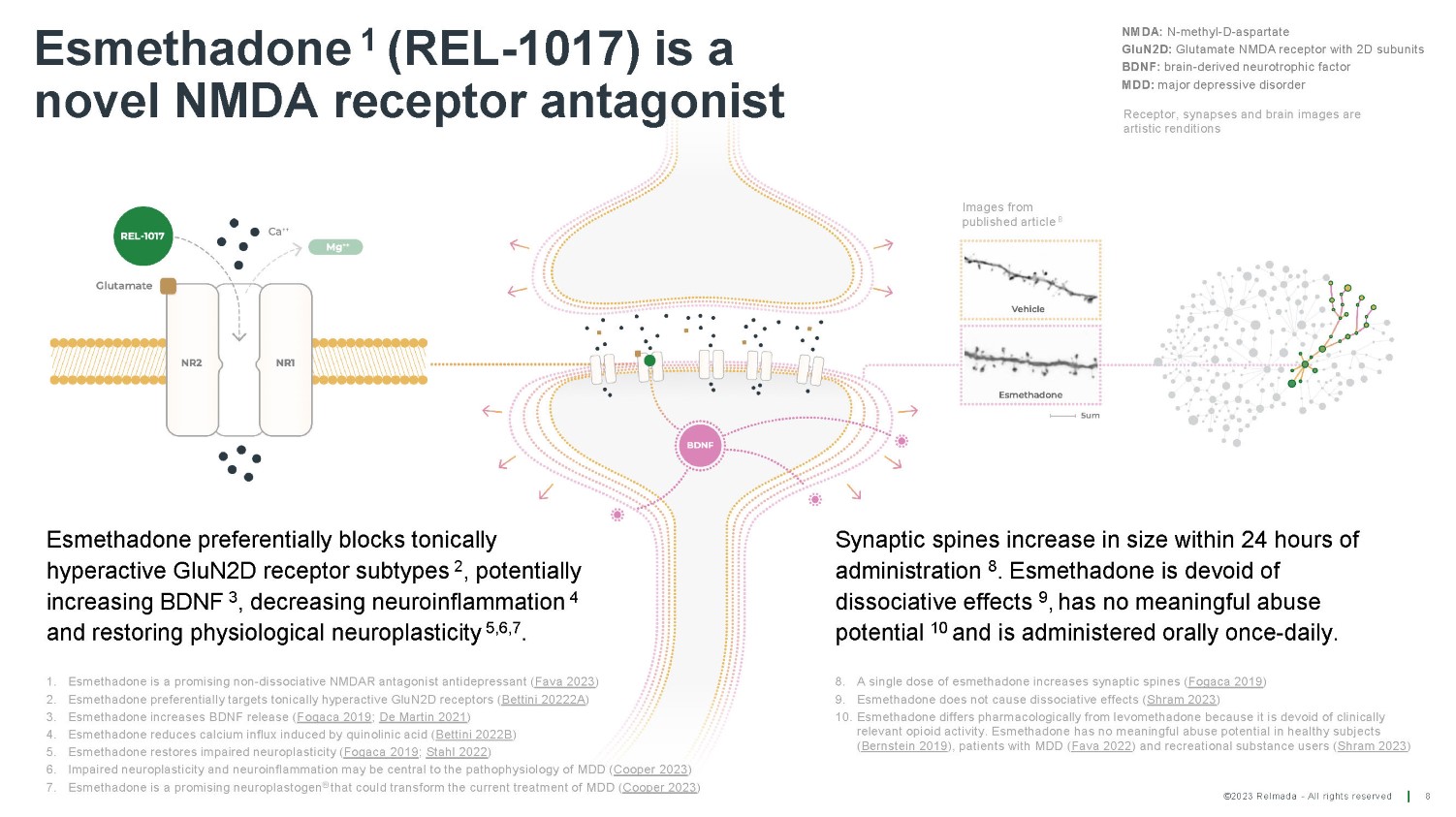 Esmethadone 1 (REL - 1017) is a novel NMDA receptor antagonist Esmethadone preferentially blocks tonically hyperactive GluN2D receptor subtypes 2 , potentially increasing BDNF 3 , decreasing neuroinflammation 4 and restoring physiological neuroplasticity 5,6,7 . NMDA: N - methyl - D - aspartate GluN2D: Glutamate NMDA receptor with 2D subunits BDNF: brain - derived neurotrophic factor MDD: major depressive disorder Synaptic spines increase in size within 24 hours of administration 8 . Esmethadone is devoid of dissociative effects 9 , has no meaningful abuse potential 10 and is administered orally once - daily. Images from published article 8 Receptor, synapses and brain images are artistic renditions 8 ©2023 Relmada - All rights reserved 8. A single dose of esmethadone increases synaptic spines ( Fogaca 2019 ) 9. Esmethadone does not cause dissociative effects ( Shram 2023 ) 10. Esmethadone differs pharmacologically from levomethadone because it is devoid of clinically relevant opioid activity. Esmethadone has no meaningful abuse potential in healthy subjects ( Bernstein 2019 ), patients with MDD ( Fava 2022 ) and recreational substance users ( Shram 2023 ) 1. Esmethadone is a promising non - dissociative NMDAR antagonist antidepressant ( Fava 2023 ) 2. Esmethadone preferentially targets tonically hyperactive GluN2D receptors ( Bettini 20222A ) 3. Esmethadone increases BDNF release ( Fogaca 2019 ; De Martin 2021 ) 4. Esmethadone reduces calcium influx induced by quinolinic acid ( Bettini 2022B ) 5. Esmethadone restores impaired neuroplasticity ( Fogaca 2019 ; Stahl 2022 ) 6. Impaired neuroplasticity and neuroinflammation may be central to the pathophysiology of MDD ( Cooper 2023 ) 7. Esmethadone is a promising neuroplastogen ® that could transform the current treatment of MDD ( Cooper 2023 )
