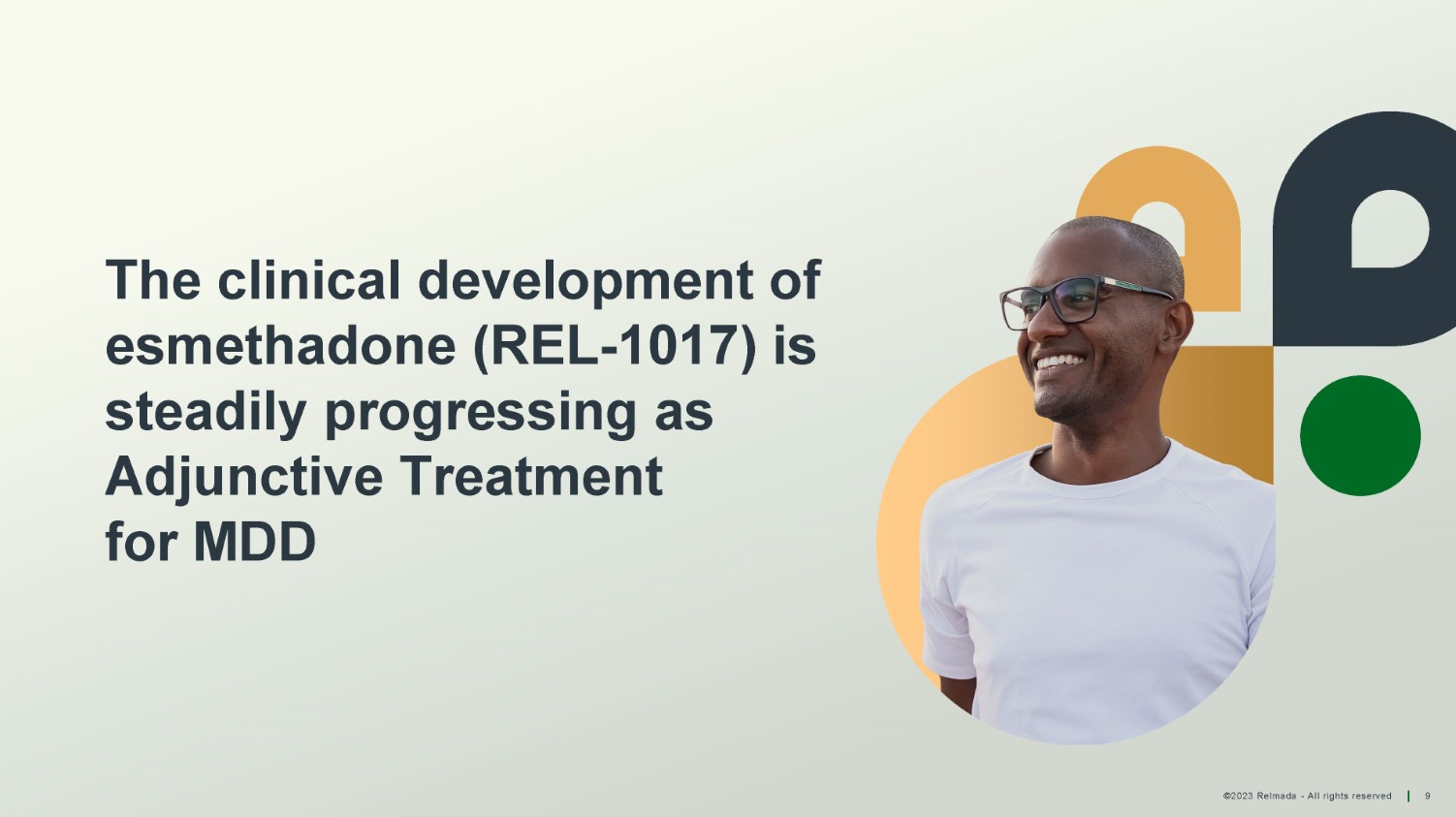©2023 Relmada - All rights reserved 9 The clinical development of esmethadone (REL - 1017) is steadily progressing as Adjunctive Treatment for MDD