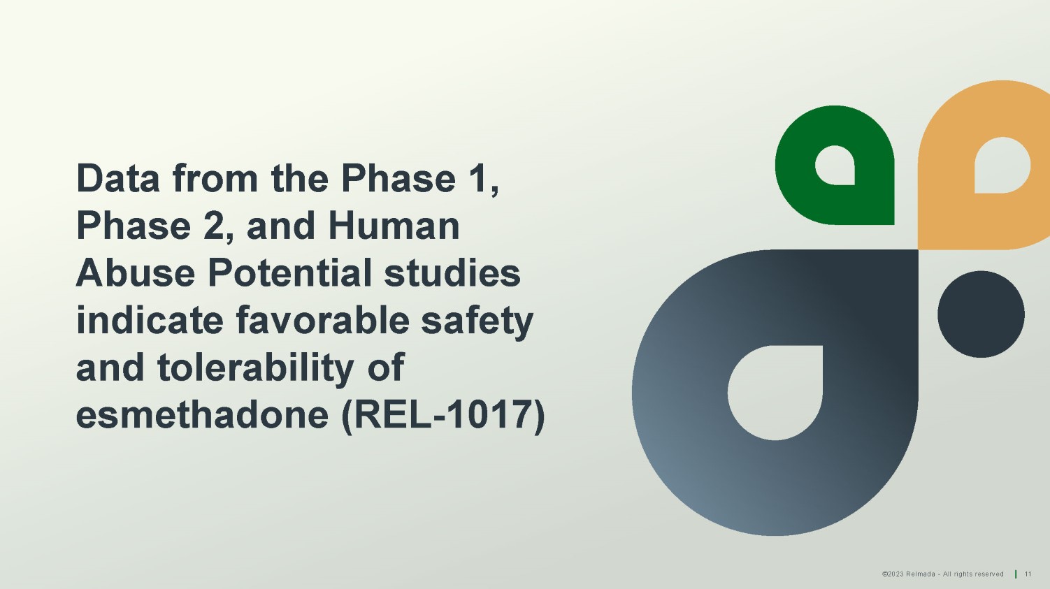 ©2023 Relmada - All rights reserved 11 Data from the Phase 1, Phase 2, and Human Abuse Potential studies indicate favorable safety and tolerability of esmethadone (REL - 1017)