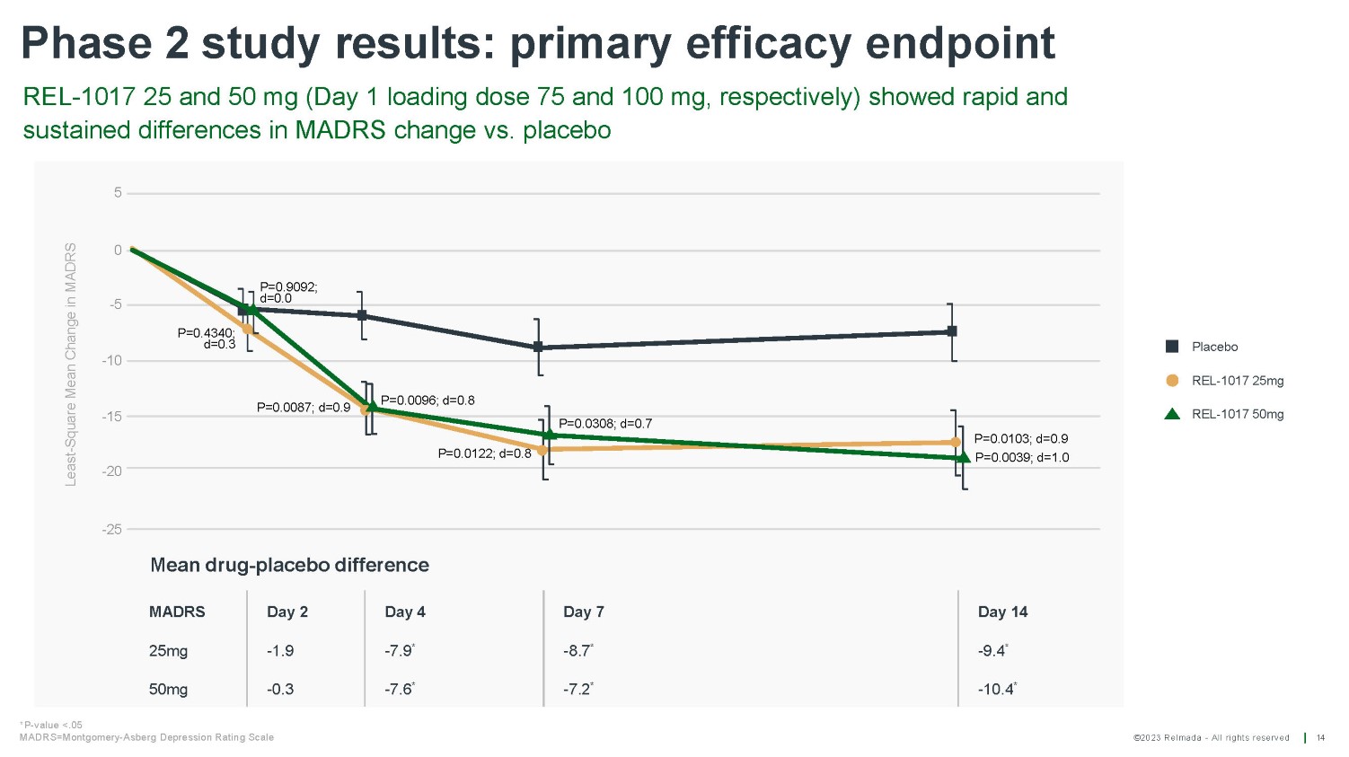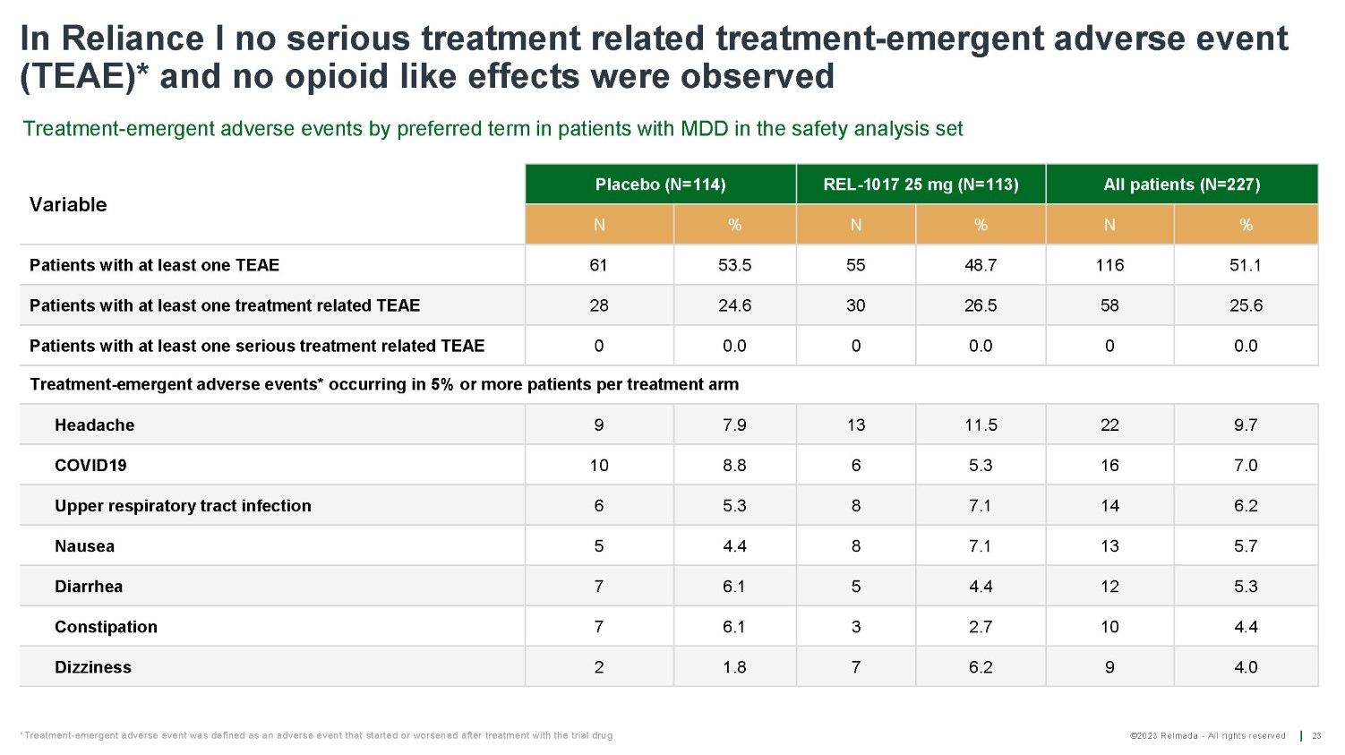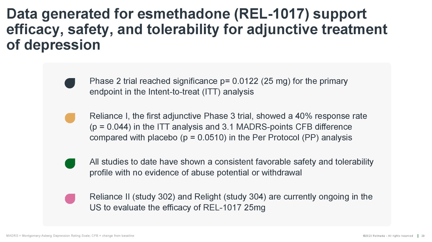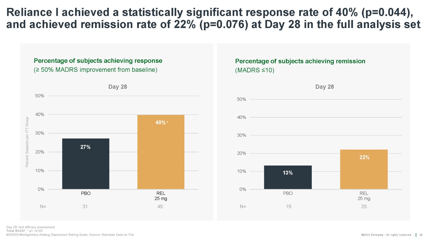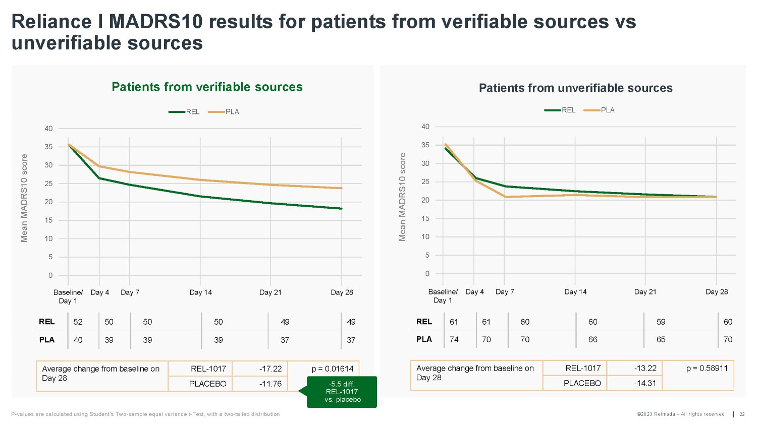 ©2023 Relmada - All rights reserved Baseline/ Day 1 Day 4 Day 7 Day 14 Day 21 Day 28 Reliance I MADRS10 results for patients from verifiable sources vs unverifiable sources 22 REL 52 50 50 50 49 49 PLA 40 39 39 39 37 37 Average change from baseline on Day 28 REL - 1017 - 17.22 PLACEBO - 11.76 Average change from baseline on Day 28 REL - 1017 - 13.22 p = 0.58911 PLACEBO - 14.31 Mean MADRS10 score Mean MADRS10 score Baseline/ Day 4 Day 1 Day 7 Day 14 Day 21 Day 28 REL 61 61 60 60 59 60 PLA 74 70 70 66 65 70 P - values are calculated using Student's Two - sample equal variance t - Test, with a two - tailed distribution 0 5 10 15 20 25 30 35 40 Patients from verifiable sources REL PLA p = 0.01614 - 5.5 diff. REL - 1017 vs. placebo 0 5 10 15 20 25 30 35 40 Patients from unverifiable sources REL PLA