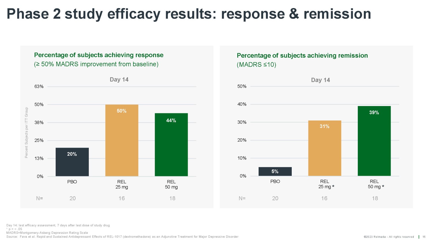 ©2023 Relmada - All rights reserved Phase 2 study results: primary efficacy endpoint REL - 1017 25 and 50 mg (Day 1 loading dose 75 and 100 mg, respectively) showed rapid and sustained differences in MADRS change vs. placebo 14 Least - Square Mean Change in MADRS 5 0 - 5 - 10 - 15 - 20 - 25 P=0.0103; d=0.9 P=0.0039; d=1.0 P=0.0308; d=0.7 P=0.0122; d=0.8 P=0.0096; d=0.8 P=0.0087; d=0.9 P=0.9092; d=0.0 P=0.4340; d=0.3 Day 7 Day 14 - 8.7 * - 9.4 * - 7.6 * - 7.2 * - 10.4 * 50mg - 0.3 *P - value <.05 MADRS=Montgomery - Asberg Depression Rating Scale Placebo REL - 1017 25mg REL - 1017 50mg Mean drug - placebo difference MADRS Day 2 Day 4 25mg - 1.9 - 7.9 *