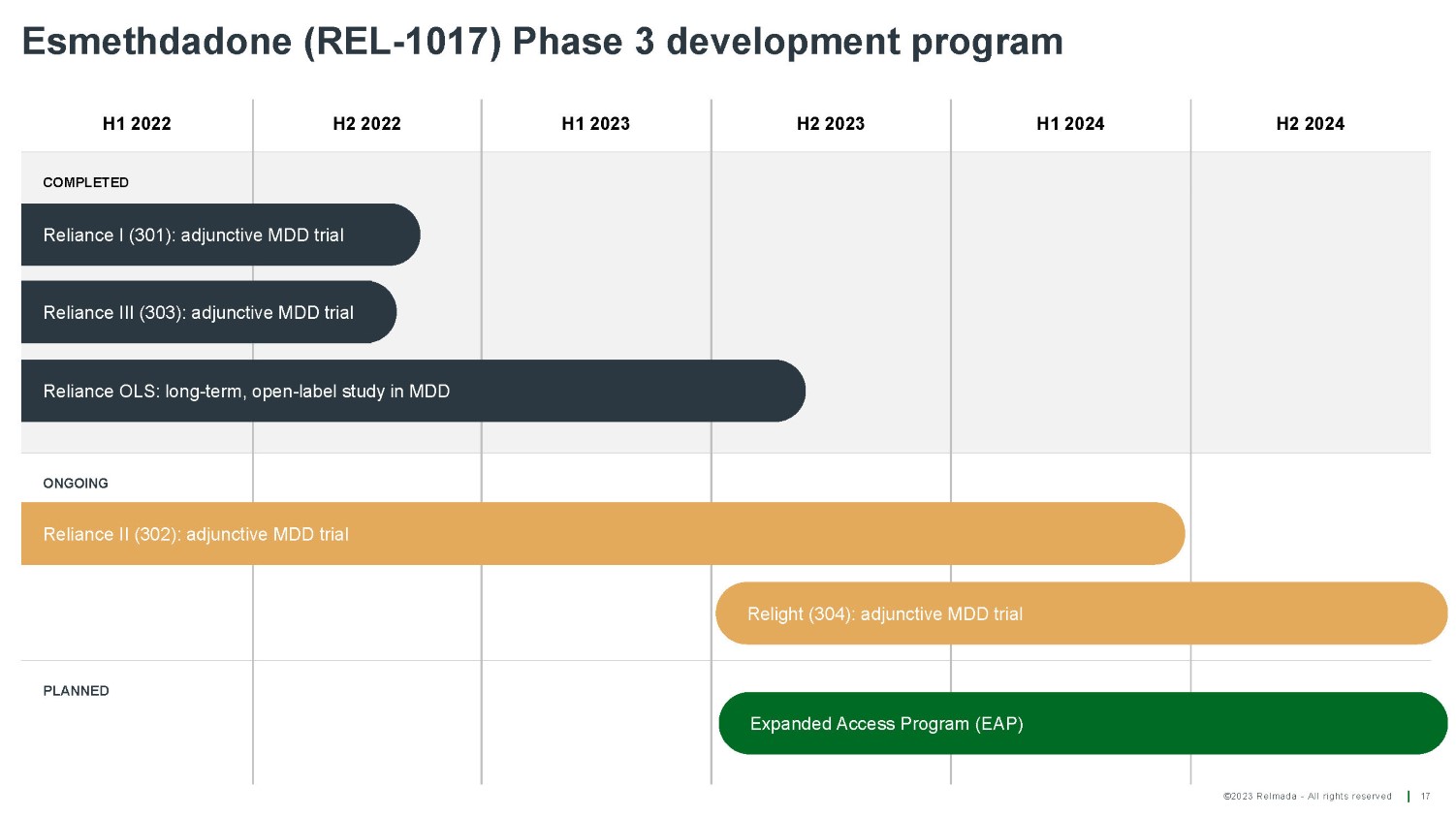 ©2023 Relmada - All rights reserved 16 The Phase 3 program as Adjunctive Treatment for MDD is currently ongoing