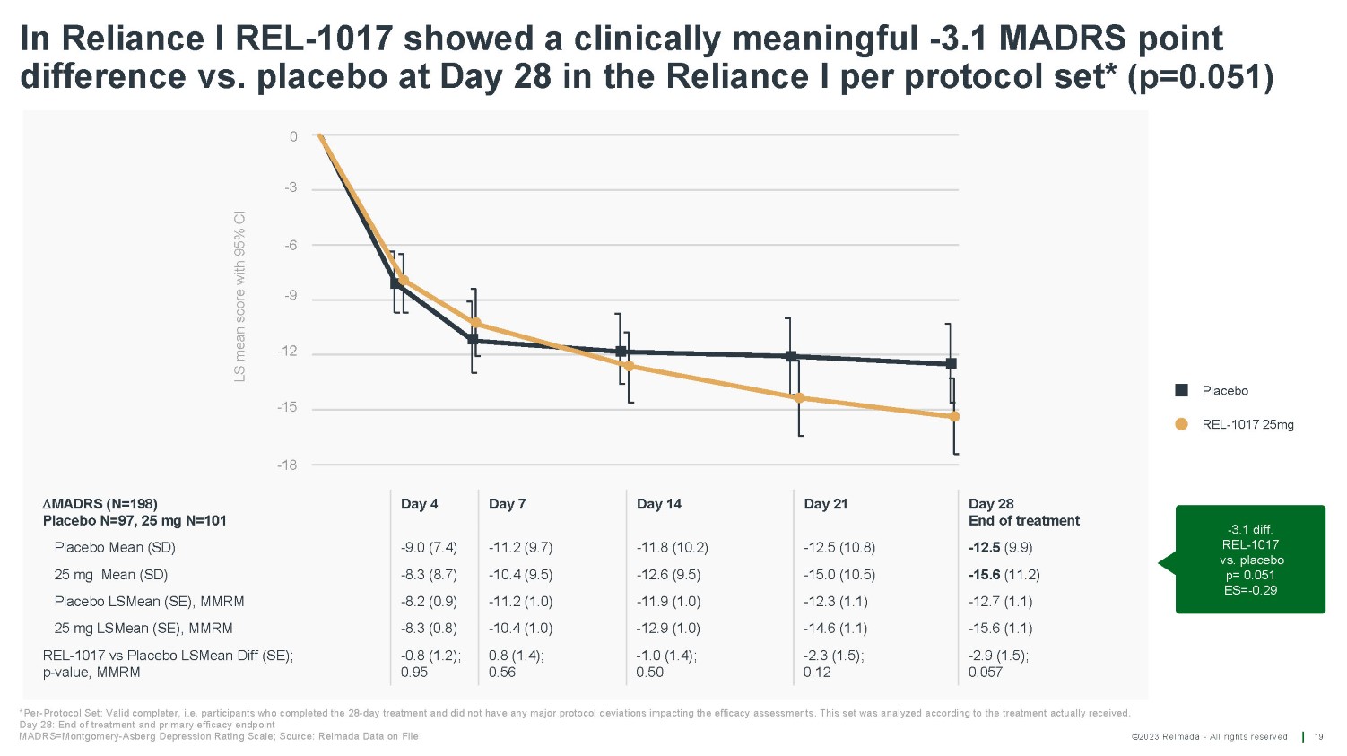 ©2023 Relmada - All rights reserved LS mean change from baseline in MADRS10 total score (+/ - 95% CI) 0 - 5 - 10 - 15 Reliance I primary efficacy endpoint: REL - 1017 showed a clinically meaningful - 2.3 MADRS point difference vs. placebo at Day 28 in the full analysis set 18 Day 28: last efficacy assessment Total N=227 ; MADRS=Montgomery - Asberg Depression Rating Scale; Source: Relmada Data on File MADRS (N=227) Placebo N=114, 25 mg N=113, 43 sites Day 4 Day 7 Day 14 Day 21 Day 28 End of treatment Placebo Mean (SD) - 9.3 (7.3) - 11.8 (9.9) - 12.2 (10.9) - 13.0 (11.2) - 12.9 (10.4) 25 mg Mean (SD) - 8.3 (8.9) - 10.2 (9.5) - 12.4 (9.4) - 14.4 (10.4) - 15.1 (11.3) Placebo LSMean (SE), MMRM - 8.5 (0.8) - 11.9 (0.9) - 12.4 (1.0) - 13.0 (1.0) - 13.4 (1.1) 25 mg LSMean (SE), MMRM - 8.3 (0.8) - 10.2 (0.9) - 12.6 (1.0) - 14.2 (1.0) - 15.1 (1.1) REL - 1017 vs Placebo LSMean Diff (SE); p - value, MMRM 0.2 (1.2); 0.85 1.7 (1.3); 0.20 - 0.2 (1.4); 0.88 - 1.2 (1.5); 0.42 - 1.7 (1.5); 0.26 Placebo REL - 1017 25mg - 2.3 diff. REL - 1017 vs. placebo p=0.15 ES= - 0.21