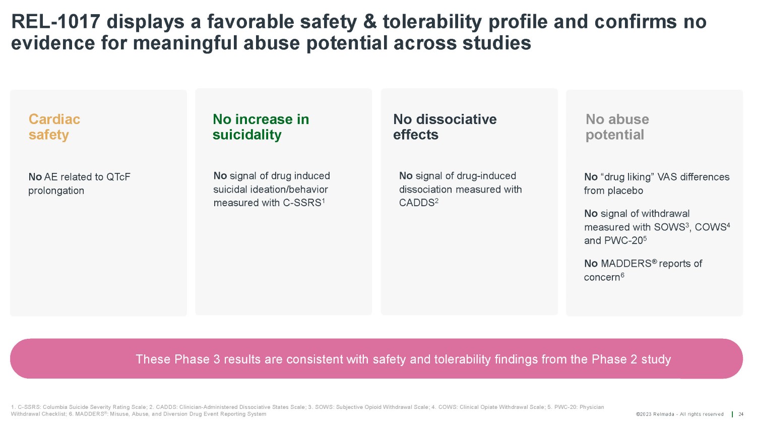 ©2023 Relmada - All rights reserved In Reliance I no serious treatment related treatment - emergent adverse event (TEAE)* and no opioid like effects were observed 23 Variable Placebo (N=114) REL - 1017 25 mg (N=113) All patients (N=227) N % N % N % Patients with at least one TEAE 61 53.5 55 48.7 116 51.1 Patients with at least one treatment related TEAE 28 24.6 30 26.5 58 25.6 Patients with at least one serious treatment related TEAE 0 0.0 0 0.0 0 0.0 Headache 9 7.9 13 11.5 22 9.7 COVID19 10 8.8 6 5.3 16 7.0 Upper respiratory tract infection 6 5.3 8 7.1 14 6.2 Nausea 5 4.4 8 7.1 13 5.7 Diarrhea 7 6.1 5 4.4 12 5.3 Constipation 7 6.1 3 2.7 10 4.4 Dizziness 2 1.8 7 6.2 9 4.0 Treatment - emergent adverse events* occurring in 5% or more patients per treatment arm Treatment - emergent adverse events by preferred term in patients with MDD in the safety analysis set *Treatment - emergent adverse event was defined as an adverse event that started or worsened after treatment with the trial drug