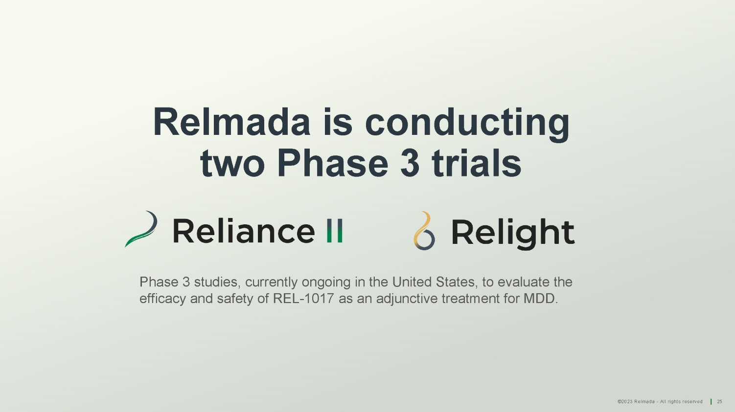 ©2023 Relmada - All rights reserved 25 Relmada is conducting two Phase 3 trials Phase 3 studies, currently ongoing in the United States, to evaluate the efficacy and safety of REL - 1017 as an adjunctive treatment for MDD.