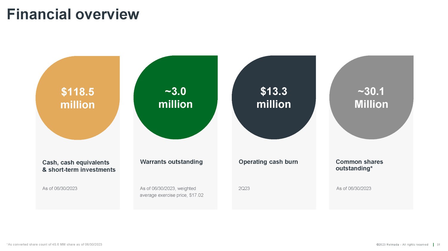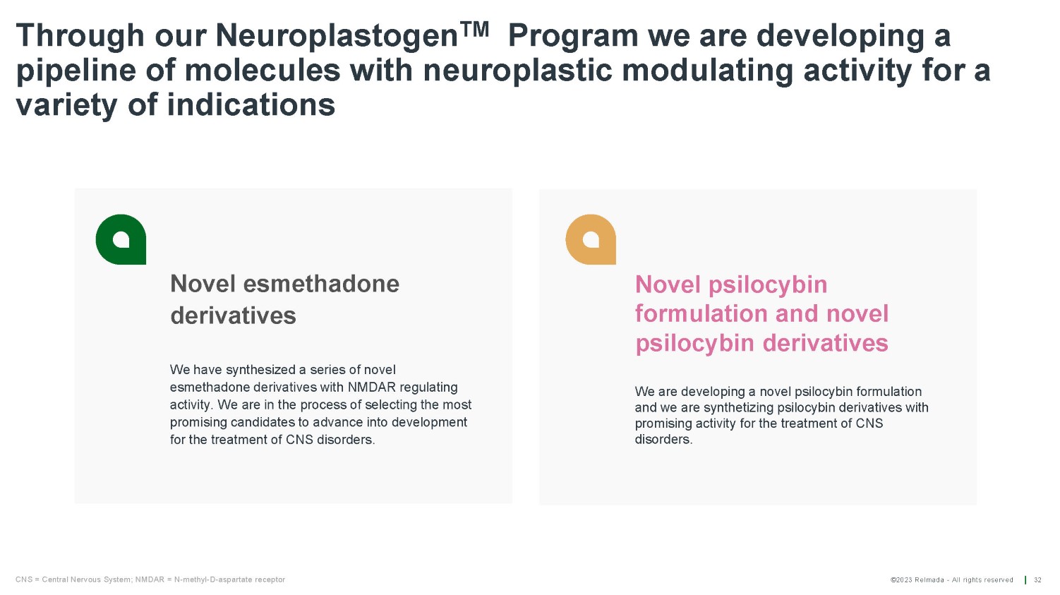 ©2023 Relmada - All rights reserved Warrants outstanding Operating cash burn Common shares outstanding* Financial overview 31 Cash, cash equivalents & short - term investments $118.5 million ~3.0 million $13.3 million ~30.1 Million As of 06/30/2023, weighted average exercise price, $17.02 2Q23 As of 06/30/2023 As of 06/30/2023 *As converted share count of 45.6 MM share as of 06/30/2023