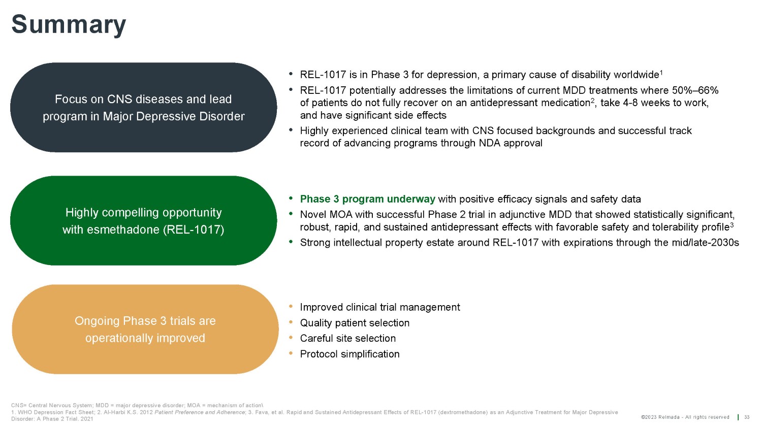 ©2023 Relmada - All rights reserved The Human Abuse Potential studies have been successfully completed and indicate no abuse potential of REL - 1017 13 “The d - isomer lacks significant respiratory depressant action and addiction liability...” US Drug Enforcement Administration December 2019 4 1. Henningfield, et al. REL - 1017 (esmethadone; D - methadone) does not cause reinforcing effect, physical dependence and withdrawal signs in Sprague Dawley rats. Sci Rep 12, 11389 (2022); 2. Shram M, et al., No meaningful abuse potential in recreational opioid users of REL - 1017 (esmethadone hydrochloride), a new NMDAR antagonist and potential rapid - acting antidepressant American Society of Clinical Psychopharmacology (ASCP) 2022; 3. Shram M, et al., No meaningful abuse potential in recreational ketamine users of REL - 1017 (esmethadone hydrochloride), a new NMDAR antagonist and potential rapid - acting antidepressant. American Society of Clinical Psychopharmacology (ASCP) 2022; 4. US DEA Statement on Methadone, December 2019 February 2022 The results of experimental studies predictive of human abuse potential 1 and the results of human abuse potential studies in recreational opioid users 2 and in recreational ketamine users 3 indicate no meaningful abuse potential and support the DEA statement below: