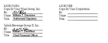 This INTELLECTUAL PROPERTY LICENSE AGREEMENT (this “Agreement”), dated as of April 4, 2025 (the “Effective Date”), is by and between Copa Di Vino Wine Group Inc. and Splash Beverage Group II, Inc. (collectively, the “Licensors”) and Copa Di Vino Corporation (the “Licensee”).