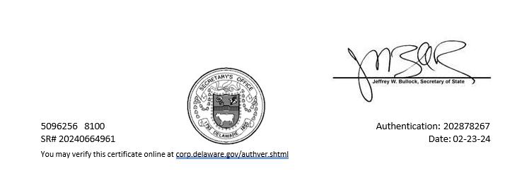 IN WITNESS WHEREOF, the Corporation has caused this Certificate of Amendment to be duly adopted and executed in its corporate name and on its behalf by its duly authorized officer as of the 23rd day of February, 2024.
