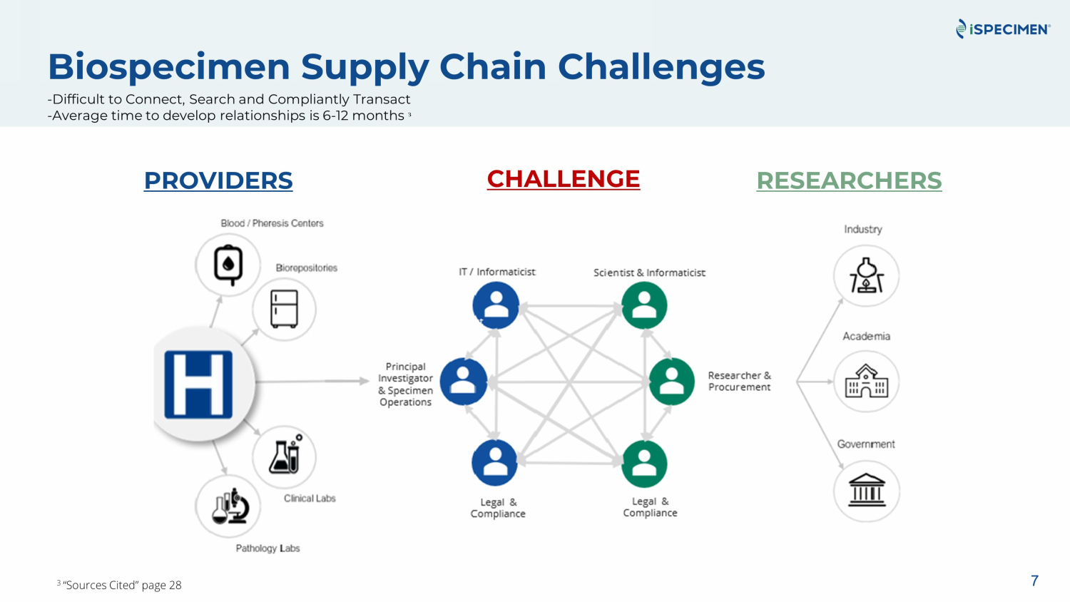 Biospecimen Supply Chain Challenges Providers miss revenue and research opportunities > 3 Billion clinical specimens are discarded annually worldwide 5 > 1 Billion Patient encounters yearly in the U.S. where a specimen could be provided for research 4 > 800 Million banked specimens are in biorepository inventories worldwide 6 6 Researchers limit their work … in 2022, 78% of researchers said they find it difficult - to - extremely difficult to find the type and quantity of specimens they need 8 “Challenging” and “Inefficient” most common words used to describe biospecimen procurement process by researchers 8 10 years ago, 81% of researchers said they limit the scope of their work due to difficulties obtaining biospecimens 7 4,5,6,7,8 “Sources Cited” page 28