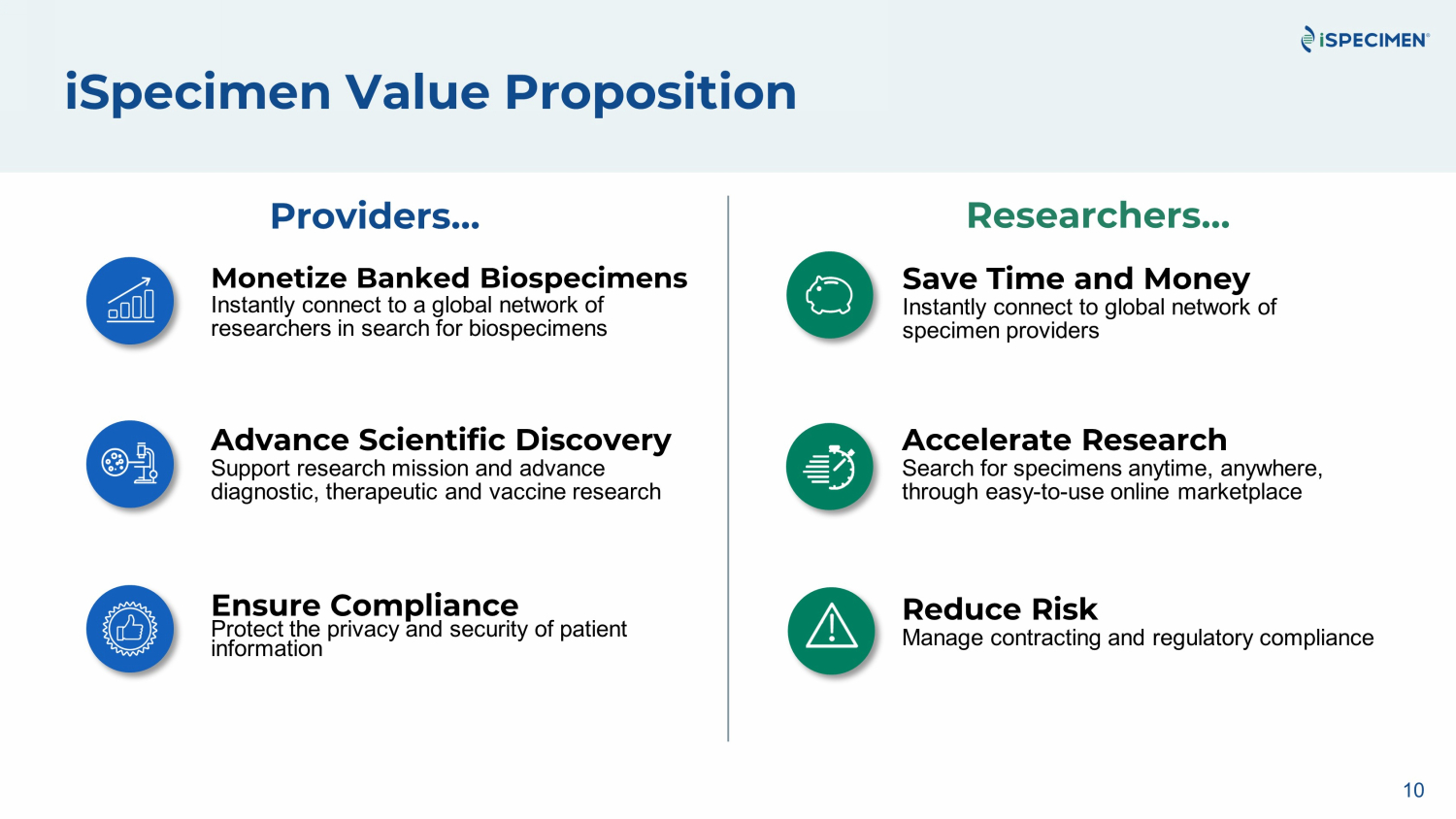 Full - Service Procurement Offering - Connect Suppliers with Researchers - Manage the Entire Procurement Process SPECIMEN SEARCH & SELECTION SPECIMEN LOGISTICS SPECIMEN MANAGEMENT DATA MANAGEMENT STUDY/ORDER MANAGEMENT SUPPLIER SITE TRAINING COLLECTION KIT BUILDING COMPLIANCE MANAGEMENT STUDY DESIGN & SPECIFICATION CONTRACTING 9 iSpecimen Services