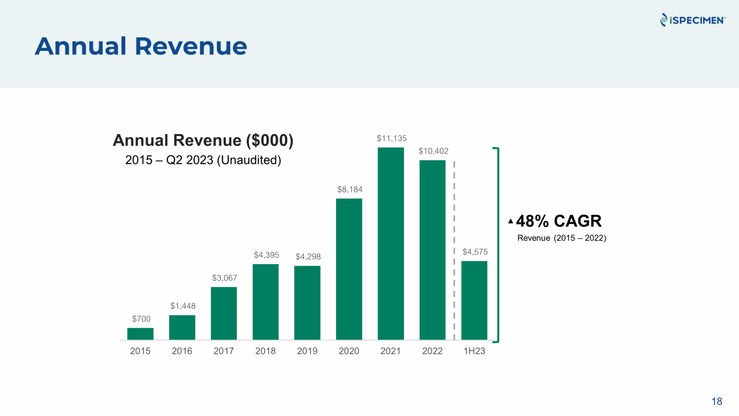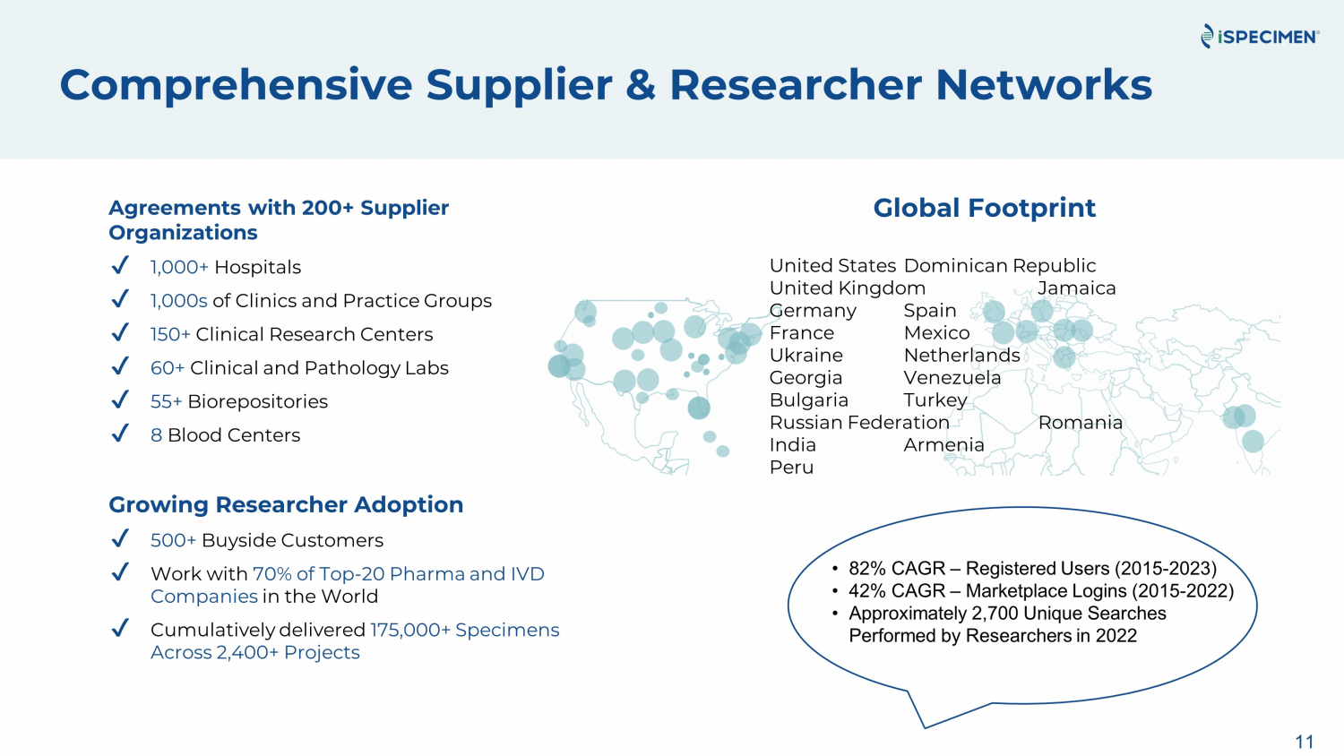 Global Footprint United States Dominican Republic United Kingdom Jamaica Germany Spain France Mexico Ukraine Netherlands Georgia Venezuela Bulgaria Turkey Russian Federation Romania India Armenia Peru 11 Agreements with 200+ Supplier Organizations ✔ 1,000+ Hospitals ✔ 1,000s of Clinics and Practice Groups ✔ 150+ Clinical Research Centers ✔ 60+ Clinical and Pathology Labs ✔ 55+ Biorepositories ✔ 8 Blood Centers Growing Researcher Adoption ✔ 500+ Buyside Customers ✔ Work with 70% of Top - 20 Pharma and IVD Companies in the World ✔ Cumulatively delivered 175,000+ Specimens Across 2,400+ Projects • 82% CAGR – Registered Users (2015 - 2023) • 42% CAGR – Marketplace Logins (2015 - 2022) • Approximately 2,700 Unique Searches Performed by Researchers in 2022 Comprehensive Supplier & Researcher Networks