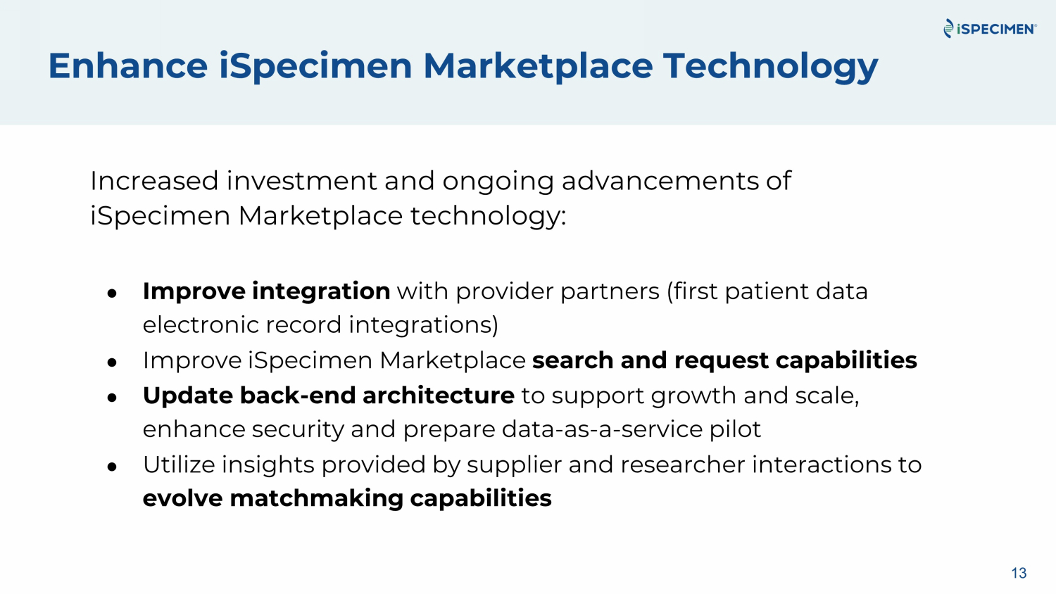 Enhance iSpecimen Marketplace Technology 13 Increased investment and ongoing advancements of iSpecimen Marketplace technology: ● Improve integration with provider partners (first patient data electronic record integrations) ● Improve iSpecimen Marketplace search and request capabilities ● Update back - end architecture to support growth and scale, enhance security and prepare data - as - a - service pilot ● Utilize insights provided by supplier and researcher interactions to evolve matchmaking capabilities