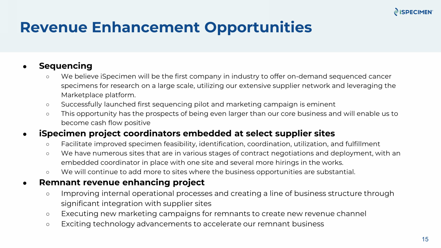 Revenue Enhancement Opportunities 15 ● Sequencing ○ We believe iSpecimen will be the first company in industry to offer on - demand sequenced cancer specimens for research on a large scale, utilizing our extensive supplier network and leveraging the Marketplace platform. ○ Successfully launched first sequencing pilot and marketing campaign is eminent ○ This opportunity has the prospects of being even larger than our core business and will enable us to become cash flow positive ● iSpecimen project coordinators embedded at select supplier sites ○ Facilitate improved specimen feasibility, identification, coordination, utilization, and fulfillment ○ We have numerous sites that are in various stages of contract negotiations and deployment, with an embedded coordinator in place with one site and several more hirings in the works. ○ We will continue to add more to sites where the business opportunities are substantial. ● Remnant revenue enhancing project ○ Improving internal operational processes and creating a line of business structure through significant integration with supplier sites ○ Executing new marketing campaigns for remnants to create new revenue channel ○ Exciting technology advancements to accelerate our remnant business