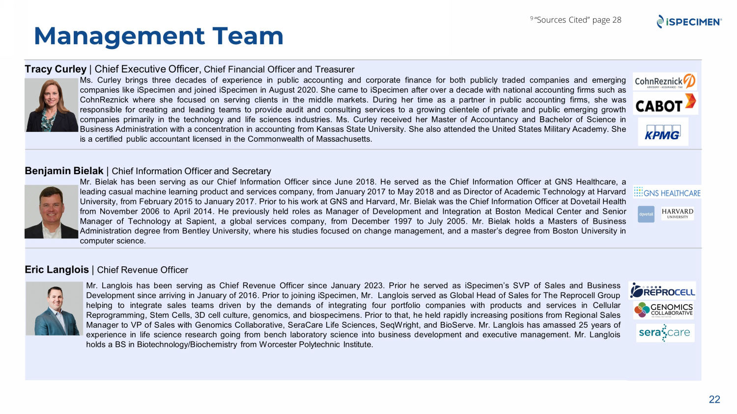 Tracy Curley | Chief Executive Officer, Chief Financial Officer and Treasurer Ms . Curley brings three decades of experience in public accounting and corporate finance for both publicly traded companies and emerging companies like iSpecimen and joined iSpecimen in August 2020 . She came to iSpecimen after over a decade with national accounting firms such as CohnReznick where she focused on serving clients in the middle markets . During her time as a partner in public accounting firms, she was responsible for creating and leading teams to provide audit and consulting services to a growing clientele of private and public emerging growth companies primarily in the technology and life sciences industries . Ms . Curley received her Master of Accountancy and Bachelor of Science in Business Administration with a concentration in accounting from Kansas State University . She also attended the United States Military Academy . She is a certified public accountant licensed in the Commonwealth of Massachusetts . Benjamin Bielak | Chief Information Officer and Secretary Mr . Bielak has been serving as our Chief Information Officer since June 2018 . He served as the Chief Information Officer at GNS Healthcare, a leading casual machine learning product and services company, from January 2017 to May 2018 and as Director of Academic Technology at Harvard University, from February 2015 to January 2017 . Prior to his work at GNS and Harvard, Mr . Bielak was the Chief Information Officer at Dovetail Health from November 2006 to April 2014 . He previously held roles as Manager of Development and Integration at Boston Medical Center and Senior Manager of Technology at Sapient, a global services company, from December 1997 to July 2005 . Mr . Bielak holds a Masters of Business Administration degree from Bentley University, where his studies focused on change management, and a master’s degree from Boston University in computer science . Eric Langlois | Chief Revenue Officer 22 Management Team 9 “Sources Cited” page 28 Mr . Langlois has been serving as Chief Revenue Officer since January 2023 . Prior he served as iSpecimen’s SVP of Sales and Business Development since arriving in January of 2016 . Prior to joining iSpecimen, Mr . Langlois served as Global Head of Sales for The Reprocell Group helping to integrate sales teams driven by the demands of integrating four portfolio companies with products and services in Cellular Reprogramming, Stem Cells, 3 D cell culture, genomics, and biospecimens . Prior to that, he held rapidly increasing positions from Regional Sales Manager to VP of Sales with Genomics Collaborative, SeraCare Life Sciences, SeqWright, and BioServe . Mr . Langlois has amassed 25 years of experience in life science research going from bench laboratory science into business development and executive management . Mr . Langlois holds a BS in Biotechnology/Biochemistry from Worcester Polytechnic Institute .
