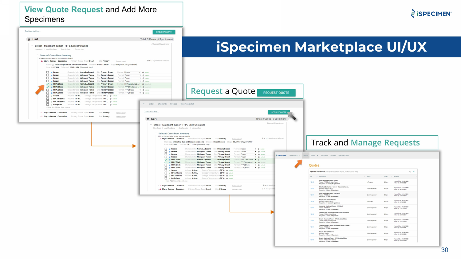 View Quote Request and Add More Specimens Request a Quote iSpecimen Marketplace UI/UX 30 Track and Manage Requests