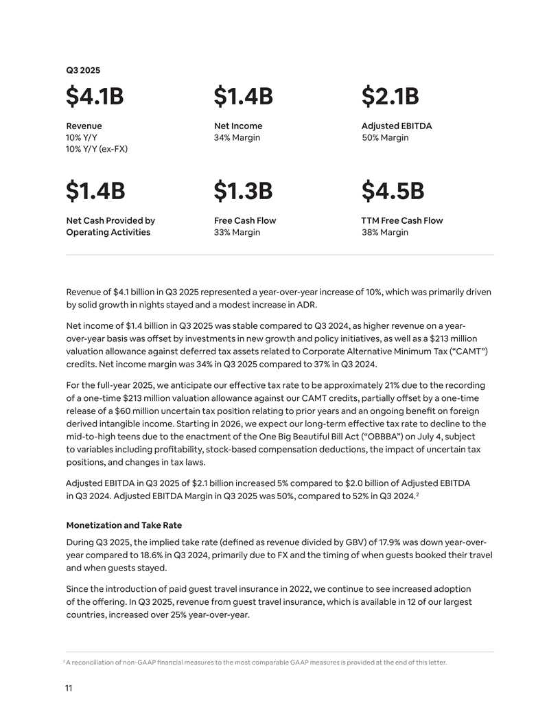 Q3 2025 $4.1B $1.4B $2.1B Revenue Net Income Adjusted EBITDA 10% Y/Y 34% Margin 50% Margin 10% Y/Y (ex-FX) $1.4B $1.3B $4.5B Net Cash Provided by Free Cash Flow TTM Free Cash Flow Operating Activities 33% Margin 38% Margin Revenue of $4.1 billion in Q3 2025 represented a year-over-year increase of 10%, which was primarily driven by solid growth in nights stayed and a modest increase in ADR. Net income of $1.4 billion in Q3 2025 was stable compared to Q3 2024, as higher revenue on a year- over-year basis was offset by investments in new growth and policy initiatives, as well as a $213 million valuation allowance against deferred tax assets related to Corporate Alternative Minimum Tax (“CAMT”) credits. Net income margin was 34% in Q3 2025 compared to 37% in Q3 2024. For the full-year 2025, we anticipate our effective tax rate to be approximately 21% due to the recording of a one-time $213 million valuation allowance against our CAMT credits, partially offset by a one-time release of a $60 million uncertain tax position relating to prior years and an ongoing benefit on foreign derived intangible income. Starting in 2026, we expect our long-term effective tax rate to decline to the mid-to-high teens due to the enactment of the One Big Beautiful Bill Act (“OBBBA”) on July 4, subject to variables including profitability, stock-based compensation deductions, the impact of uncertain tax positions, and changes in tax laws. Adjusted EBITDA in Q3 2025 of $2.1 billion increased 5% compared to $2.0 billion of Adjusted EBITDA 2 in Q3 2024. Adjusted EBITDA Margin in Q3 2025 was 50%, compared to 52% in Q3 2024. Monetization and Take Rate During Q3 2025, the implied take rate (defined as revenue divided by GBV) of 17.9% was down year-over- year compared to 18.6% in Q3 2024, primarily due to FX and the timing of when guests booked their travel and when guests stayed. Since the introduction of paid guest travel insurance in 2022, we continue to see increased adoption of the offering. In Q3 2025, revenue from guest travel insurance, which is available in 12 of our largest countries, increased over 25% year-over-year. 2 A reconciliation of non-GAAP financial measures to the most comparable GAAP measures is provided at the end of this letter. 11