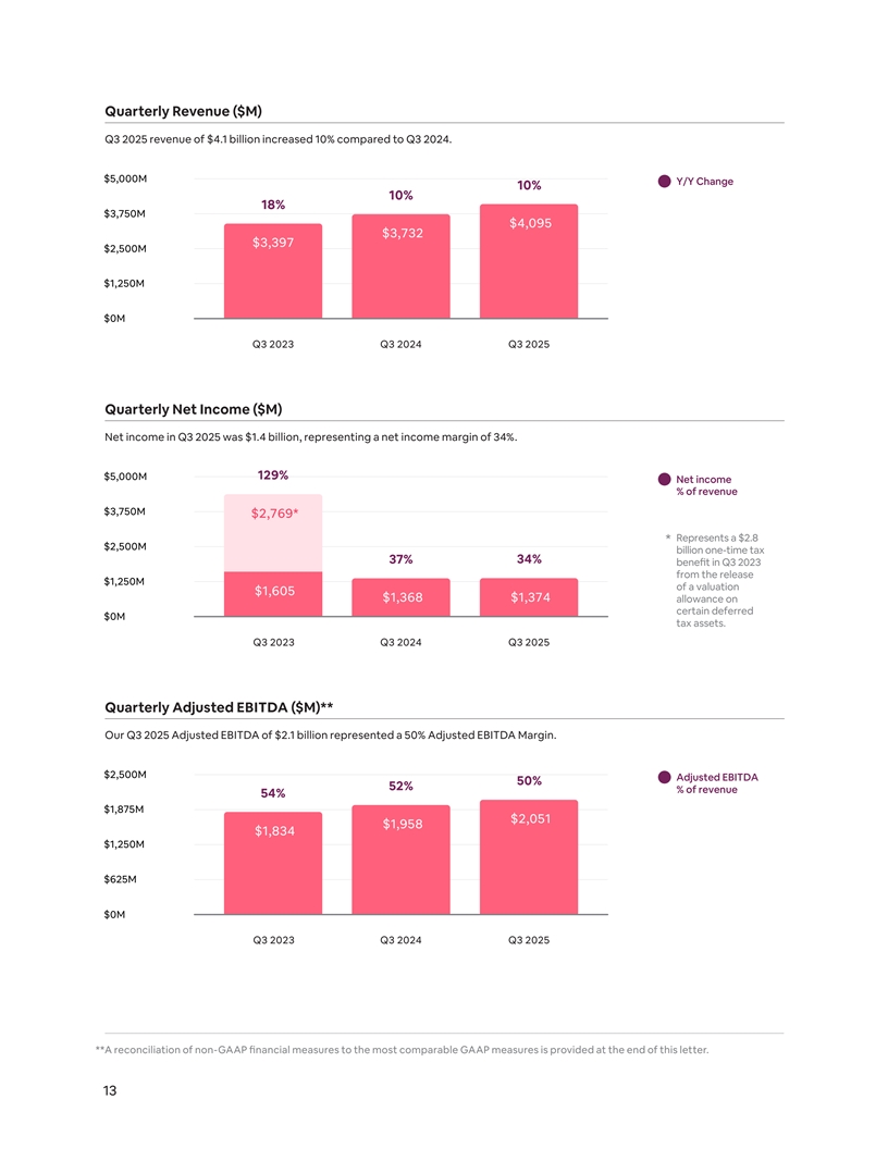 Quarterly Revenue ($M) Q3 2025 revenue of $4.1 billion increased 10% compared to Q3 2024. $5,000M Y/Y Change 10% 10% 18% $3,750M $4,095 $3,732 $3,397 $2,500M $1,250M $0M Q3 2023 Q3 2024 Q3 2025 Quarterly Net Income ($M) Net income in Q3 2025 was $1.4 billion, representing a net income margin of 34%. $5,000M 129% Net income % of revenue $3,750M $2,769* Represents a $2.8 * $2,500M billion one-time tax 37% 34% benefit in Q3 2023 from the release $1,250M of a valuation $1,605 $1,368 $1,374 allowance on certain deferred $0M tax assets. Q3 2023 Q3 2024 Q3 2025 Quarterly Adjusted EBITDA ($M)** Our Q3 2025 Adjusted EBITDA of $2.1 billion represented a 50% Adjusted EBITDA Margin. $2,500M Adjusted EBITDA 50% 52% % of revenue 54% $1,875M $2,051 $1,958 $1,834 $1,250M $625M $0M Q3 2023 Q3 2024 Q3 2025 **A reconciliation of non-GAAP financial measures to the most comparable GAAP measures is provided at the end of this letter. 13