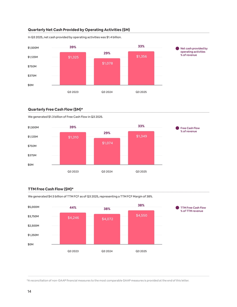 Quarterly Net Cash Provided by Operating Activities ($M) In Q3 2025, net cash provided by operating activities was $1.4 billion. 33% 39% $1,500M Net cash provided by operating activities 29% % of revenue $1,356 $1,125M $1,325 $1,078 $750M $375M $0M Q3 2023 Q3 2024 Q3 2025 Quarterly Free Cash Flow ($M)* We generated $1.3 billion of Free Cash Flow in Q3 2025. 33% $1,500M 39% Free Cash Flow % of revenue 29% $1,125M $1,349 $1,310 $1,074 $750M $375M $0M Q3 2023 Q3 2024 Q3 2025 TTM Free Cash Flow ($M)* We generated $4.5 billion of TTM FCF as of Q3 2025, representing a TTM FCF Margin of 38%. 38% $5,000M TTM Free Cash Flow 44% 38% % of TTM revenue $4,550 $3,750M $4,246 $4,072 $2,500M $1,250M $0M Q3 2023 Q3 2024 Q3 2025 *A reconciliation of non-GAAP financial measures to the most comparable GAAP measures is provided at the end of this letter. 14