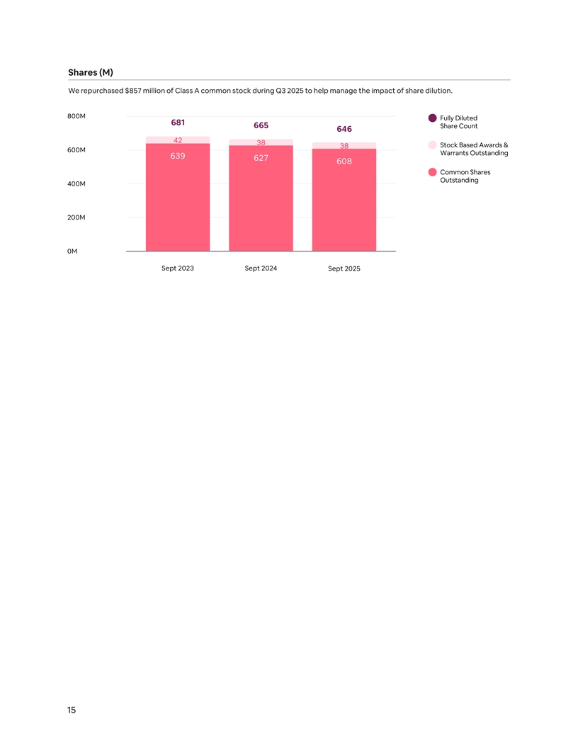 Shares (M) We repurchased $857 million of Class A common stock during Q3 2025 to help manage the impact of share dilution. 800M Fully Diluted 681 665 Share Count 646 42 38 Stock Based Awards & 38 600M Warrants Outstanding 639 627 608 Common Shares Outstanding 400M 200M 0M Sept 2023 Sept 2024 Sept 2025 15