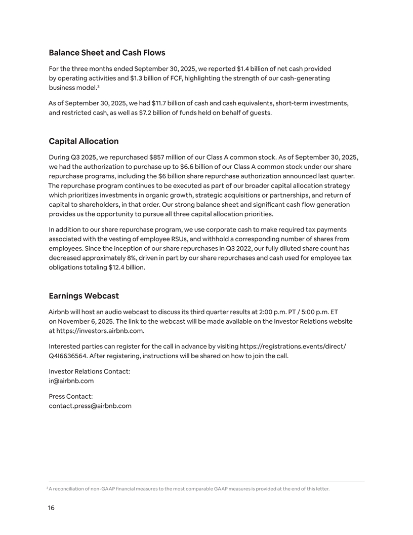 Balance Sheet and Cash Flows For the three months ended September 30, 2025, we reported $1.4 billion of net cash provided by operating activities and $1.3 billion of FCF, highlighting the strength of our cash-generating 3 business model. As of September 30, 2025, we had $11.7 billion of cash and cash equivalents, short-term investments, and restricted cash, as well as $7.2 billion of funds held on behalf of guests. Capital Allocation During Q3 2025, we repurchased $857 million of our Class A common stock. As of September 30, 2025, we had the authorization to purchase up to $6.6 billion of our Class A common stock under our share repurchase programs, including the $6 billion share repurchase authorization announced last quarter. The repurchase program continues to be executed as part of our broader capital allocation strategy which prioritizes investments in organic growth, strategic acquisitions or partnerships, and return of capital to shareholders, in that order. Our strong balance sheet and significant cash flow generation provides us the opportunity to pursue all three capital allocation priorities. In addition to our share repurchase program, we use corporate cash to make required tax payments associated with the vesting of employee RSUs, and withhold a corresponding number of shares from employees. Since the inception of our share repurchases in Q3 2022, our fully diluted share count has decreased approximately 8%, driven in part by our share repurchases and cash used for employee tax obligations totaling $12.4 billion. Earnings Webcast Airbnb will host an audio webcast to discuss its third quarter results at 2:00 p.m. PT / 5:00 p.m. ET on November 6, 2025. The link to the webcast will be made available on the Investor Relations website at https://investors.airbnb.com. Interested parties can register for the call in advance by visiting https://registrations.events/direct/ Q4I6636564. After registering, instructions will be shared on how to join the call. Investor Relations Contact: ir@airbnb.com Press Contact: contact.press@airbnb.com 3 A reconciliation of non-GAAP financial measures to the most comparable GAAP measures is provided at the end of this letter. 16