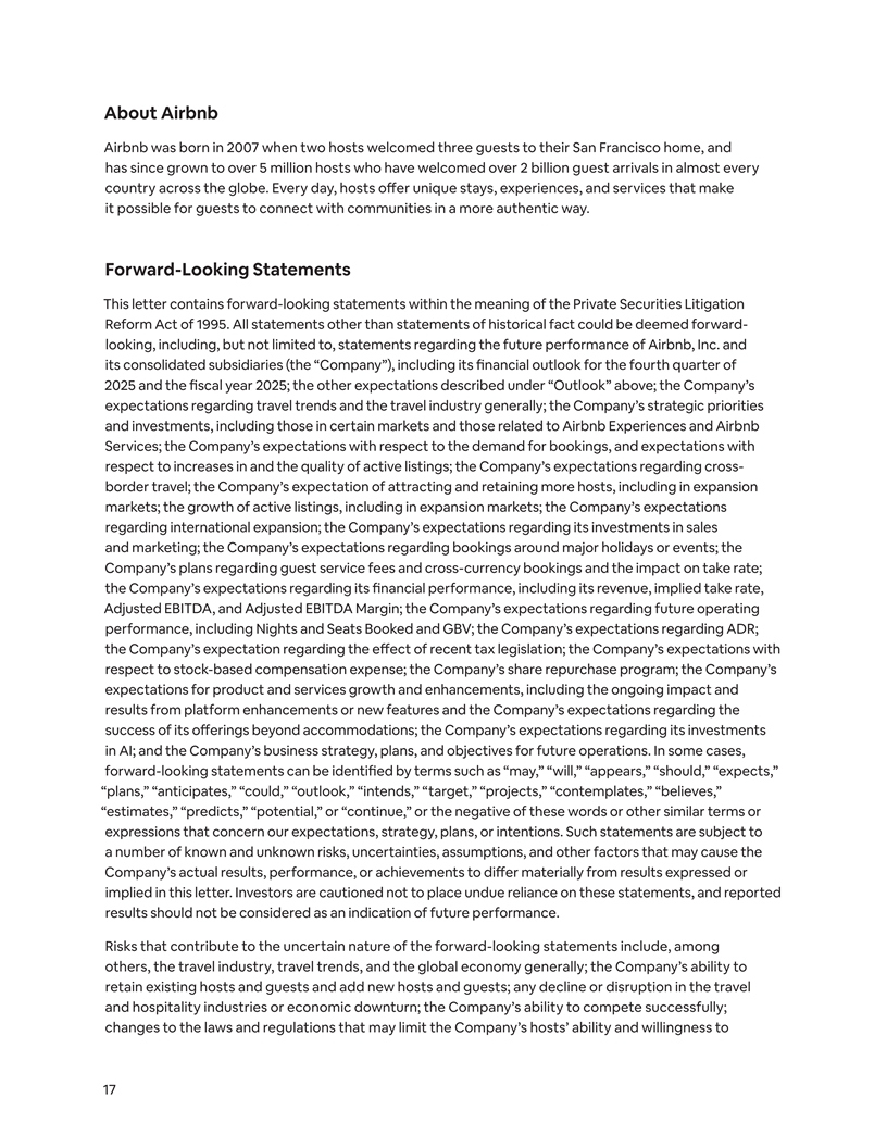 About Airbnb Airbnb was born in 2007 when two hosts welcomed three guests to their San Francisco home, and has since grown to over 5 million hosts who have welcomed over 2 billion guest arrivals in almost every country across the globe. Every day, hosts offer unique stays, experiences, and services that make it possible for guests to connect with communities in a more authentic way. Forward-Looking Statements This letter contains forward-looking statements within the meaning of the Private Securities Litigation Reform Act of 1995. All statements other than statements of historical fact could be deemed forward- looking, including, but not limited to, statements regarding the future performance of Airbnb, Inc. and its consolidated subsidiaries (the “Company”), including its financial outlook for the fourth quarter of 2025 and the fiscal year 2025; the other expectations described under “Outlook” above; the Company’s expectations regarding travel trends and the travel industry generally; the Company’s strategic priorities and investments, including those in certain markets and those related to Airbnb Experiences and Airbnb Services; the Company’s expectations with respect to the demand for bookings, and expectations with respect to increases in and the quality of active listings; the Company’s expectations regarding cross- border travel; the Company’s expectation of attracting and retaining more hosts, including in expansion markets; the growth of active listings, including in expansion markets; the Company’s expectations regarding international expansion; the Company’s expectations regarding its investments in sales and marketing; the Company’s expectations regarding bookings around major holidays or events; the Company’s plans regarding guest service fees and cross-currency bookings and the impact on take rate; the Company’s expectations regarding its financial performance, including its revenue, implied take rate, Adjusted EBITDA, and Adjusted EBITDA Margin; the Company’s expectations regarding future operating performance, including Nights and Seats Booked and GBV; the Company’s expectations regarding ADR; the Company’s expectation regarding the effect of recent tax legislation; the Company’s expectations with respect to stock-based compensation expense; the Company’s share repurchase program; the Company’s expectations for product and services growth and enhancements, including the ongoing impact and results from platform enhancements or new features and the Company’s expectations regarding the success of its offerings beyond accommodations; the Company’s expectations regarding its investments in AI; and the Company’s business strategy, plans, and objectives for future operations. In some cases, forward-looking statements can be identified by terms such as “may,” “will,” “appears,” “should,” “expects,” “plans,” “anticipates,” “could,” “outlook,” “intends,” “target,” “projects,” “contemplates,” “believes,” “estimates,” “predicts,” “potential,” or “continue,” or the negative of these words or other similar terms or expressions that concern our expectations, strategy, plans, or intentions. Such statements are subject to a number of known and unknown risks, uncertainties, assumptions, and other factors that may cause the Company’s actual results, performance, or achievements to differ materially from results expressed or implied in this letter. Investors are cautioned not to place undue reliance on these statements, and reported results should not be considered as an indication of future performance. Risks that contribute to the uncertain nature of the forward-looking statements include, among others, the travel industry, travel trends, and the global economy generally; the Company’s ability to retain existing hosts and guests and add new hosts and guests; any decline or disruption in the travel and hospitality industries or economic downturn; the Company’s ability to compete successfully; changes to the laws and regulations that may limit the Company’s hosts’ ability and willingness to 17