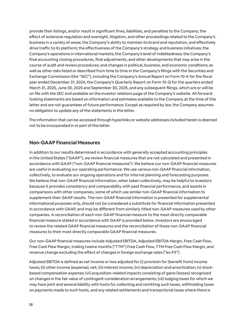 provide their listings, and/or result in significant fines, liabilities, and penalties to the Company; the effect of extensive regulation and oversight, litigation, and other proceedings related to the Company’s business in a variety of areas; the Company’s ability to maintain its brand and reputation, and effectively drive traffic to its platform; the effectiveness of the Company’s strategy and business initiatives; the Company’s operations in international markets; the Company’s level of indebtedness; the Company’s final accounting closing procedures, final adjustments, and other developments that may arise in the course of audit and review procedures; and changes in political, business, and economic conditions; as well as other risks listed or described from time to time in the Company’s filings with the Securities and Exchange Commission (the “SEC”), including the Company’s Annual Report on Form 10-K for the fiscal year ended December 31, 2024, the Company’s Quarterly Report on Form 10-Q for the quarters ended March 31, 2025, June 30, 2025 and September 30, 2025, and any subsequent filings, which are or will be on file with the SEC and available on the investor relations page of the Company’s website. All forward- looking statements are based on information and estimates available to the Company at the time of this letter and are not guarantees of future performance. Except as required by law, the Company assumes no obligation to update any of the statements in this letter. The information that can be accessed through hyperlinks or website addresses included herein is deemed not to be incorporated in or part of this letter. Non-GAAP Financial Measures In addition to our results determined in accordance with generally accepted accounting principles in the United States (“GAAP”), we review financial measures that are not calculated and presented in accordance with GAAP (“non-GAAP financial measures”). We believe our non-GAAP financial measures are useful in evaluating our operating performance. We use various non-GAAP financial information, collectively, to evaluate our ongoing operations and for internal planning and forecasting purposes. We believe that non-GAAP financial information, when taken collectively, may be helpful to investors because it provides consistency and comparability with past financial performance, and assists in comparisons with other companies, some of which use similar non-GAAP financial information to supplement their GAAP results. The non-GAAP financial information is presented for supplemental informational purposes only, should not be considered a substitute for financial information presented in accordance with GAAP, and may be different from similarly titled non-GAAP measures used by other companies. A reconciliation of each non-GAAP financial measure to the most directly comparable financial measure stated in accordance with GAAP is provided below. Investors are encouraged to review the related GAAP financial measures and the reconciliation of these non-GAAP financial measures to their most directly comparable GAAP financial measures. Our non-GAAP financial measures include Adjusted EBITDA, Adjusted EBITDA Margin, Free Cash Flow, Free Cash Flow Margin, trailing twelve months (“TTM”) Free Cash Flow, TTM Free Cash Flow Margin, and revenue change excluding the effect of changes in foreign exchange rates (“ex-FX”). Adjusted EBITDA is defined as net income or loss adjusted for (i) provision for (benefit from) income taxes; (ii) other income (expense), net; (iii) interest income; (iv) depreciation and amortization; (v) stock- based compensation expense; (vi) acquisition-related impacts consisting of gains (losses) recognized on changes in the fair value of contingent consideration arrangements; (vii) lodging taxes for which we may have joint and several liability with hosts for collecting and remitting such taxes, withholding taxes on payments made to such hosts, and any related settlements and transactional taxes where there is 18