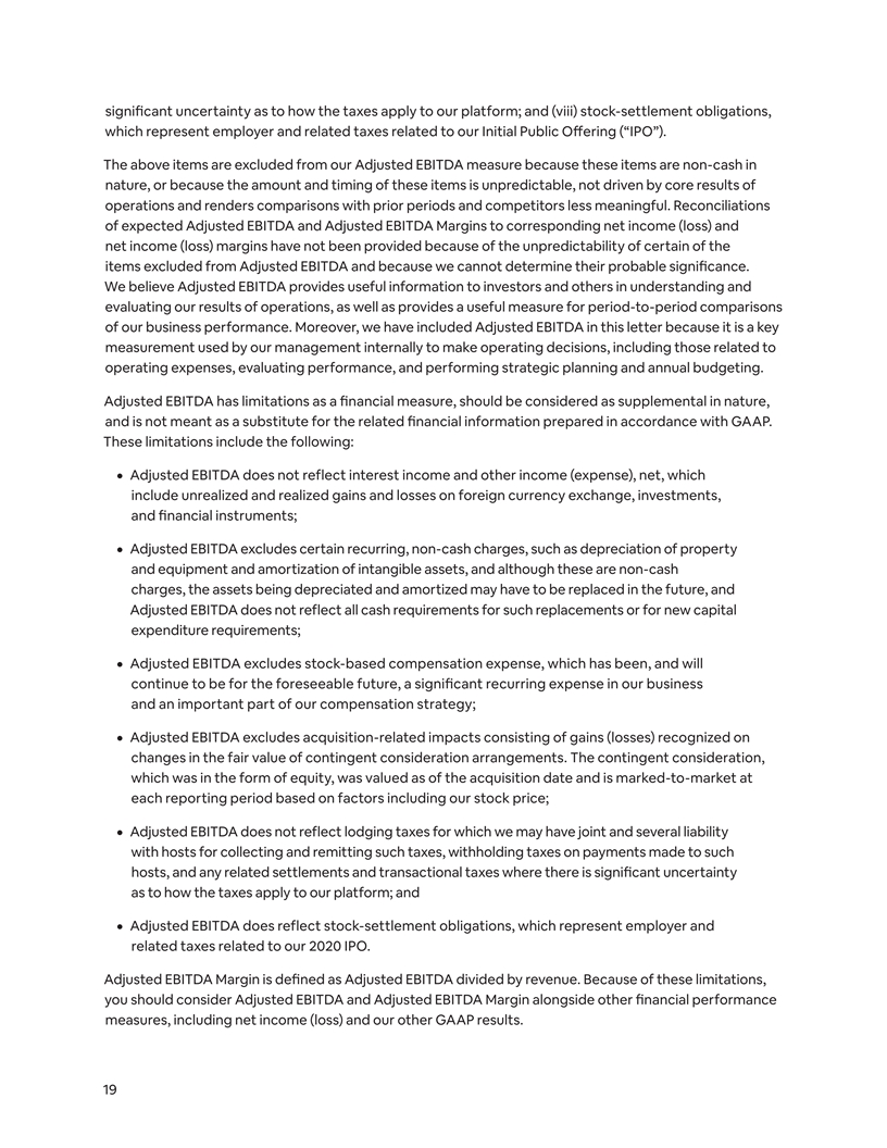 significant uncertainty as to how the taxes apply to our platform; and (viii) stock-settlement obligations, which represent employer and related taxes related to our Initial Public Offering (“IPO”). The above items are excluded from our Adjusted EBITDA measure because these items are non-cash in nature, or because the amount and timing of these items is unpredictable, not driven by core results of operations and renders comparisons with prior periods and competitors less meaningful. Reconciliations of expected Adjusted EBITDA and Adjusted EBITDA Margins to corresponding net income (loss) and net income (loss) margins have not been provided because of the unpredictability of certain of the items excluded from Adjusted EBITDA and because we cannot determine their probable significance. We believe Adjusted EBITDA provides useful information to investors and others in understanding and evaluating our results of operations, as well as provides a useful measure for period-to-period comparisons of our business performance. Moreover, we have included Adjusted EBITDA in this letter because it is a key measurement used by our management internally to make operating decisions, including those related to operating expenses, evaluating performance, and performing strategic planning and annual budgeting. Adjusted EBITDA has limitations as a financial measure, should be considered as supplemental in nature, and is not meant as a substitute for the related financial information prepared in accordance with GAAP. These limitations include the following: ¦ Adjusted EBITDA does not reflect interest income and other income (expense), net, which include unrealized and realized gains and losses on foreign currency exchange, investments, and financial instruments; ¦ Adjusted EBITDA excludes certain recurring, non-cash charges, such as depreciation of property and equipment and amortization of intangible assets, and although these are non-cash charges, the assets being depreciated and amortized may have to be replaced in the future, and Adjusted EBITDA does not reflect all cash requirements for such replacements or for new capital expenditure requirements; ¦ Adjusted EBITDA excludes stock-based compensation expense, which has been, and will continue to be for the foreseeable future, a significant recurring expense in our business and an important part of our compensation strategy; ¦ Adjusted EBITDA excludes acquisition-related impacts consisting of gains (losses) recognized on changes in the fair value of contingent consideration arrangements. The contingent consideration, which was in the form of equity, was valued as of the acquisition date and is marked-to-market at each reporting period based on factors including our stock price; ¦ Adjusted EBITDA does not reflect lodging taxes for which we may have joint and several liability with hosts for collecting and remitting such taxes, withholding taxes on payments made to such hosts, and any related settlements and transactional taxes where there is significant uncertainty as to how the taxes apply to our platform; and ¦ Adjusted EBITDA does reflect stock-settlement obligations, which represent employer and related taxes related to our 2020 IPO. Adjusted EBITDA Margin is defined as Adjusted EBITDA divided by revenue. Because of these limitations, you should consider Adjusted EBITDA and Adjusted EBITDA Margin alongside other financial performance measures, including net income (loss) and our other GAAP results. 19