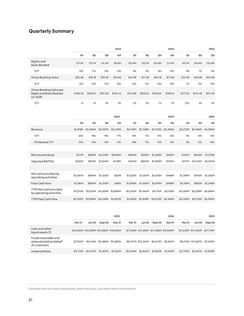 Quarterly Summary 2023 2024 2025 Q1 Q2 Q3 Q4 Q1 Q2 Q3 Q4 Q1 Q2 Q3 Nights and 121.1M 115.1M 113.2M 98.8M 132.6M 125.1M 122.8M 111.0M 143.1M 134.4M 133.6M Seats Booked 19% 11% 14% 12% 9% 9% 8% 12% 8% 7% 9% Y/Y $20.4B $19.1B $18.3B $15.5B $22.9B $21.2B $20.1B $17.6B $24.5B $23.5B $22.9B Gross Booking Value 19% 13% 17% 15% 12% 11% 10% 13% 7% 11% 14% Y/Y Gross Booking Value per $168.43 $166.01 $161.38 $156.73 $172.88 $169.53 $163.64 $158.13 $171.34 $174.48 $171.29 Night and Seats Booked (or ADR) Y/Y -% 1% 3% 3% 3% 2% 1% 1% (1)% 3% 5% 2023 2024 2025 Q1 Q2 Q3 Q4 Q1 Q2 Q3 Q4 Q1 Q2 Q3 Revenue $1,818M $2,484M $3,397M $2,218M $2,142M $2,748M $3,732M $2,480M $2,272M $3,096M $4,095M Y/Y 20% 18% 18% 17% 18% 11% 10% 12% 6% 13% 10% FX Neutral Y/Y 24% 19% 14% 14% 18% 11% 10% 12% 8% 13% 10% Net income (loss) $117M $650M $4,374M $(349)M $264M $555M $1,368M $461M $154M $642M $1,374M Adjusted EBITDA $262M $819M $1,834M $738M $424M $894M $1,958M $765M $417M $1,043M $2,051M Net cash provided by $1,587M $909M $1,325M $63M $1,923M $1,051M $1,078M $466M $1,789M $975M $1,356M operating activities Free Cash Flow $1,581M $900M $1,310M $46M $1,909M $1,043M $1,074M $458M $1,781M $962M $1,349M TTM Net cash provided $3,815M $3,923M $4,284M $3,884M $4,220M $4,362M $4,115M $4,518M $4,384M $4,308M $4,586M by operating activities $3,790M $3,894M $4,246M $3,837M $4,165M $4,308M $4,072M $4,484M $4,356M $4,275M $4,550M TTM Free Cash Flow 2023 2024 2025 Mar 31 Jun 30 Sept 30 Dec 31 Mar 31 Jun 30 Sept 30 Dec 31 Mar 31 Jun 30 Sept 30 Cash and other $10,624M $10,369M $10,986M $10,095M $11,128M $11,286M $11,280M $10,636M $11,532M $11,400M $11,719M liquid assets (1) Funds receivable and amounts held on behalf $7,760M $9,144M $5,986M $5,869M $8,737M $10,342M $6,573M $5,931M $9,175M $11,067M $7,209M of customers Unearned fees $2,172M $2,347M $1,467M $1,427M $2,434M $2,621M $1,657M $1,616M $2,723M $2,857M $1,820M 1 Includes cash and cash equivalents, restricted cash, and short-term investments. 21