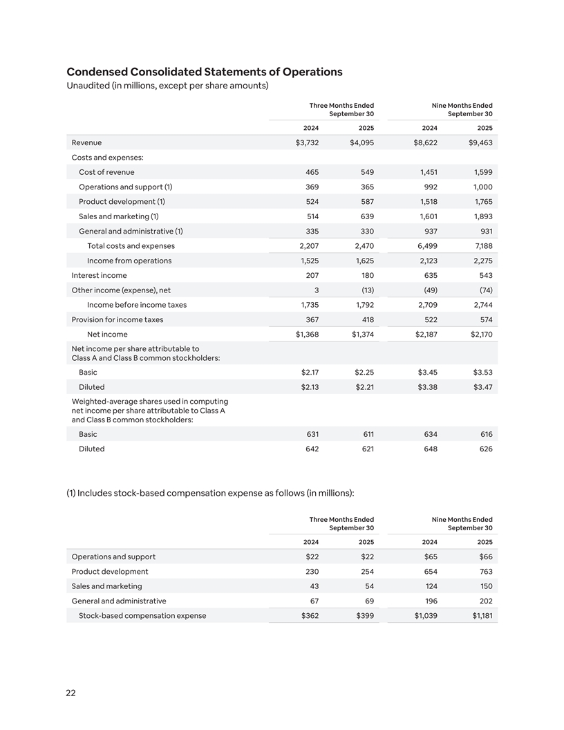 Condensed Consolidated Statements of Operations Unaudited (in millions, except per share amounts) Three Months Ended Nine Months Ended September 30 September 30 2024 2025 2024 2025 Revenue $3,732 $4,095 $8,622 $9,463 Costs and expenses: Cost of revenue 465 549 1,451 1,599 Operations and support (1) 369 365 992 1,000 Product development (1) 524 587 1,518 1,765 Sales and marketing (1) 514 639 1,601 1,893 General and administrative (1) 335 330 937 931 Total costs and expenses 2,207 2,470 6,499 7,188 Income from operations 1,525 1,625 2,123 2,275 Interest income 207 180 635 543 Other income (expense), net 3 (13) (49) (74) Income before income taxes 1,735 1,792 2,709 2,744 Provision for income taxes 367 418 522 574 Net income $1,368 $1,374 $2,187 $2,170 Net income per share attributable to Class A and Class B common stockholders: Basic $2.17 $2.25 $3.45 $3.53 Diluted $2.13 $2.21 $3.38 $3.47 Weighted-average shares used in computing net income per share attributable to Class A and Class B common stockholders: Basic 631 611 634 616 Diluted 642 621 648 626 (1) Includes stock-based compensation expense as follows (in millions): Three Months Ended Nine Months Ended September 30 September 30 2024 2025 2024 2025 Operations and support $22 $22 $65 $66 Product development 230 254 654 763 Sales and marketing 43 54 124 150 General and administrative 67 69 196 202 Stock-based compensation expense $362 $399 $1,039 $1,181 22
