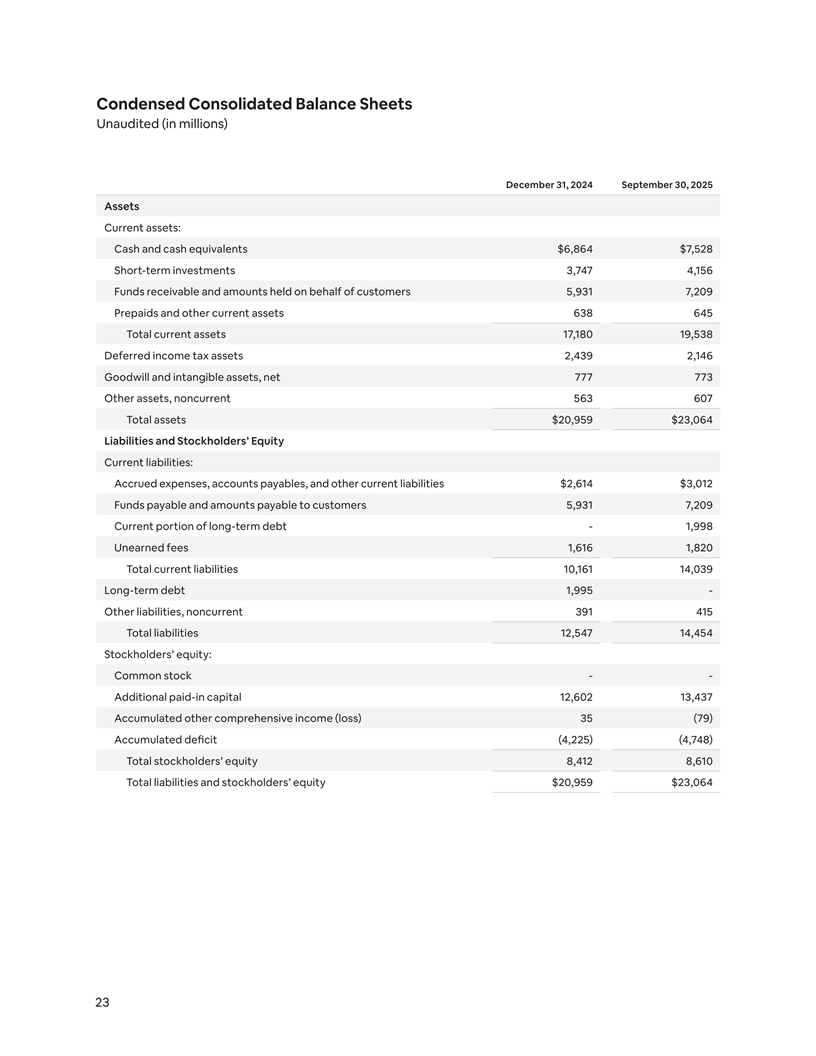 Condensed Consolidated Balance Sheets Unaudited (in millions) December 31, 2024 September 30, 2025 Assets Current assets: Cash and cash equivalents $6,864 $7,528 Short-term investments 3,747 4,156 Funds receivable and amounts held on behalf of customers 5,931 7,209 Prepaids and other current assets 638 645 Total current assets 17,180 19,538 Deferred income tax assets 2,439 2,146 Goodwill and intangible assets, net 777 773 Other assets, noncurrent 563 607 Total assets $20,959 $23,064 Liabilities and Stockholders’ Equity Current liabilities: Accrued expenses, accounts payables, and other current liabilities $2,614 $3,012 Funds payable and amounts payable to customers 5,931 7,209 Current portion of long-term debt - 1,998 Unearned fees 1,616 1,820 Total current liabilities 10,161 14,039 Long-term debt 1,995 - Other liabilities, noncurrent 391 415 Total liabilities 12,547 14,454 Stockholders’ equity: Common stock - - Additional paid-in capital 12,602 13,437 Accumulated other comprehensive income (loss) 35 (79) Accumulated deficit (4,225) (4,748) Total stockholders’ equity 8,412 8,610 Total liabilities and stockholders’ equity $20,959 $23,064 23