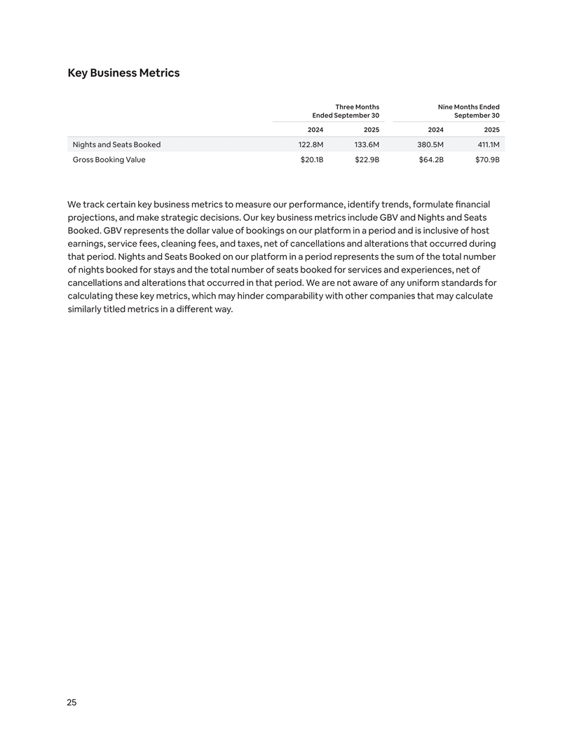 Key Business Metrics Three Months Nine Months Ended Ended September 30 September 30 2024 2025 2024 2025 Nights and Seats Booked 122.8M 133.6M 380.5M 411.1M Gross Booking Value $20.1B $22.9B $64.2B $70.9B We track certain key business metrics to measure our performance, identify trends, formulate financial projections, and make strategic decisions. Our key business metrics include GBV and Nights and Seats Booked. GBV represents the dollar value of bookings on our platform in a period and is inclusive of host earnings, service fees, cleaning fees, and taxes, net of cancellations and alterations that occurred during that period. Nights and Seats Booked on our platform in a period represents the sum of the total number of nights booked for stays and the total number of seats booked for services and experiences, net of cancellations and alterations that occurred in that period. We are not aware of any uniform standards for calculating these key metrics, which may hinder comparability with other companies that may calculate similarly titled metrics in a different way. 25