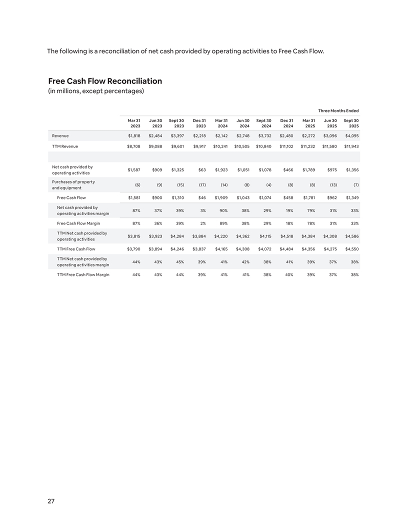 The following is a reconciliation of net cash provided by operating activities to Free Cash Flow. Free Cash Flow Reconciliation (in millions, except percentages) Three Months Ended Mar 31 Jun 30 Sept 30 Dec 31 Mar 31 Jun 30 Sept 30 Dec 31 Mar 31 Jun 30 Sept 30 2023 2023 2023 2023 2024 2024 2024 2024 2025 2025 2025 Revenue $1,818 $2,484 $3,397 $2,218 $2,142 $2,748 $3,732 $2,480 $2,272 $3,096 $4,095 TTM Revenue $8,708 $9,088 $9,601 $9,917 $10,241 $10,505 $10,840 $11,102 $11,232 $11,580 $11,943 Net cash provided by $1,587 $909 $1,325 $63 $1,923 $1,051 $1,078 $466 $1,789 $975 $1,356 operating activities Purchases of property (6) (9) (15) (17) (14) (8) (4) (8) (8) (13) (7) and equipment Free Cash Flow $1,581 $900 $1,310 $46 $1,909 $1,043 $1,074 $458 $1,781 $962 $1,349 Net cash provided by 87% 37% 39% 3% 90% 38% 29% 19% 79% 31% 33% operating activities margin Free Cash Flow Margin 87% 36% 39% 2% 89% 38% 29% 18% 78% 31% 33% TTM Net cash provided by $3,815 $3,923 $4,284 $3,884 $4,220 $4,362 $4,115 $4,518 $4,384 $4,308 $4,586 operating activities TTM Free Cash Flow $3,790 $3,894 $4,246 $3,837 $4,165 $4,308 $4,072 $4,484 $4,356 $4,275 $4,550 TTM Net cash provided by 44% 43% 45% 39% 41% 42% 38% 41% 39% 37% 38% operating activities margin TTM Free Cash Flow Margin 44% 43% 44% 39% 41% 41% 38% 40% 39% 37% 38% 27