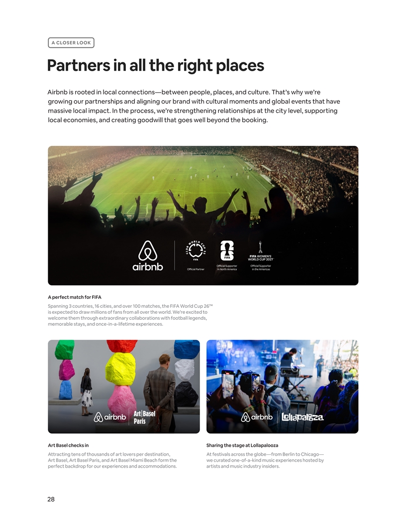 A CLOSER LOOK Partners in all the right places Airbnb is rooted in local connections—between people, places, and culture. That’s why we’re growing our partnerships and aligning our brand with cultural moments and global events that have massive local impact. In the process, we’re strengthening relationships at the city level, supporting local economies, and creating goodwill that goes well beyond the booking. A perfect match for FIFA Spanning 3 countries, 16 cities, and over 100 matches, the FIFA World Cup 26™ is expected to draw millions of fans from all over the world. We’re excited to welcome them through extraordinary collaborations with football legends, memorable stays, and once-in-a-lifetime experiences. Art Basel checks in Sharing the stage at Lollapalooza Attracting tens of thousands of art lovers per destination, At festivals across the globe—from Berlin to Chicago— Art Basel, Art Basel Paris, and Art Basel Miami Beach form the we curated one-of-a-kind music experiences hosted by perfect backdrop for our experiences and accommodations. artists and music industry insiders. 28