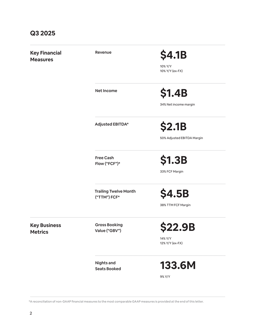 Q3 2025 Revenue Key Financial $4.1B Measures 10% Y/Y 10% Y/Y (ex-FX) Net Income $1.4B 34% Net income margin Adjusted EBITDA* $2.1B 50% Adjusted EBITDA Margin Free Cash $1.3B Flow (“FCF”)* 33% FCF Margin Trailing Twelve Month $4.5B (“TTM”) FCF* 38% TTM FCF Margin Gross Booking Key Business $22.9B Value (“GBV”) Metrics 14% Y/Y 12% Y/Y (ex-FX) Nights and 133.6M Seats Booked 9% Y/Y *A reconciliation of non-GAAP financial measures to the most comparable GAAP measures is provided at the end of this letter. 2