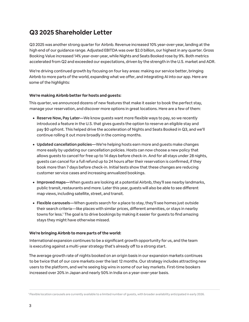 Q3 2025 Shareholder Letter Q3 2025 was another strong quarter for Airbnb. Revenue increased 10% year-over-year, landing at the high end of our guidance range. Adjusted EBITDA was over $2.0 billion, our highest in any quarter. Gross Booking Value increased 14% year-over-year, while Nights and Seats Booked rose by 9%. Both metrics accelerated from Q2 and exceeded our expectations, driven by the strength in the U.S. market and ADR. We’re driving continued growth by focusing on four key areas: making our service better, bringing Airbnb to more parts of the world, expanding what we offer, and integrating AI into our app. Here are some of the highlights: We’re making Airbnb better for hosts and guests: This quarter, we announced dozens of new features that make it easier to book the perfect stay, manage your reservation, and discover more options in great locations. Here are a few of them: ¦ Reserve Now, Pay Later—We know guests want more flexible ways to pay, so we recently introduced a feature in the U.S. that gives guests the option to reserve an eligible stay and pay $0 upfront. This helped drive the acceleration of Nights and Seats Booked in Q3, and we’ll continue rolling it out more broadly in the coming months. ¦ Updated cancellation policies—We’re helping hosts earn more and guests make changes more easily by updating our cancellation policies. Hosts can now choose a new policy that allows guests to cancel for free up to 14 days before check-in. And for all stays under 28 nights, guests can cancel for a full refund up to 24 hours after their reservation is confirmed, if they book more than 7 days before check-in. Initial tests show that these changes are reducing customer service cases and increasing annualized bookings. ¦ Improved maps—When guests are looking at a potential Airbnb, they’ll see nearby landmarks, public transit, restaurants and more. Later this year, guests will also be able to see different map views, including satellite, street, and transit. ¦ Flexible carousels—When guests search for a place to stay, they’ll see homes just outside their search criteria—like places with similar prices, different amenities, or stays in nearby 1 towns for less. The goal is to drive bookings by making it easier for guests to find amazing stays they might have otherwise missed. We’re bringing Airbnb to more parts of the world: International expansion continues to be a significant growth opportunity for us, and the team is executing against a multi-year strategy that’s already off to a strong start. The average growth rate of nights booked on an origin basis in our expansion markets continues to be twice that of our core markets over the last 12 months. Our strategy includes attracting new users to the platform, and we’re seeing big wins in some of our key markets. First-time bookers increased over 20% in Japan and nearly 50% in India on a year-over-year basis. 1 Flexible location carousels are currently available to a limited number of guests, with broader availability anticipated in early 2026. 3