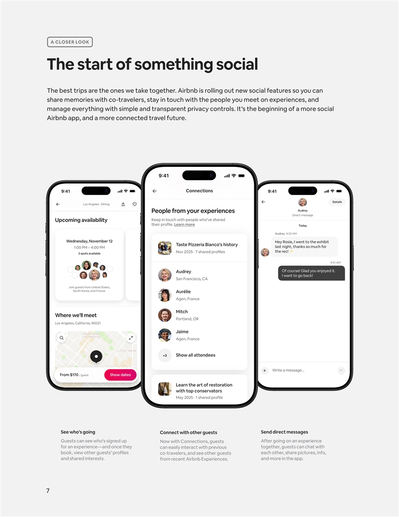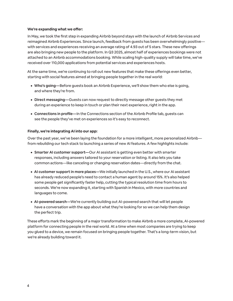 We’re expanding what we oe ff r: In May, we took the first step in expanding Airbnb beyond stays with the launch of Airbnb Services and reimagined Airbnb Experiences. Since launch, feedback from guests has been overwhelmingly positive— with services and experiences receiving an average rating of 4.93 out of 5 stars. These new offerings are also bringing new people to the platform. In Q3 2025, almost half of experiences bookings were not attached to an Airbnb accommodations booking. While scaling high-quality supply will take time, we’ve received over 110,000 applications from potential services and experiences hosts. At the same time, we’re continuing to roll out new features that make these offerings even better, starting with social features aimed at bringing people together in the real world: ¦ Who’s going—Before guests book an Airbnb Experience, we’ll show them who else is going, and where they’re from. ¦ Direct messaging—Guests can now request to directly message other guests they met during an experience to keep in touch or plan their next experience, right in the app. ¦ Connections in profile— In the Connections section of the Airbnb Profile tab, guests can see the people they’ve met on experiences so it’s easy to reconnect. Finally, we’re integrating AI into our app: Over the past year, we’ve been laying the foundation for a more intelligent, more personalized Airbnb— from rebuilding our tech stack to launching a series of new AI features. A few highlights include: ¦ Smarter AI customer support—Our AI assistant is getting even better with smarter responses, including answers tailored to your reservation or listing. It also lets you take common actions—like canceling or changing reservation dates—directly from the chat. ¦ AI customer support in more places—We initially launched in the U.S., where our AI assistant has already reduced people’s need to contact a human agent by around 15%. It’s also helped some people get significantly faster help, cutting the typical resolution time from hours to seconds. We’re now expanding it, starting with Spanish in Mexico, with more countries and languages to come. ¦ AI-powered search—We’re currently building out AI-powered search that will let people have a conversation with the app about what they’re looking for so we can help them design the perfect trip. These eo ff rts mark the beginning of a major transformation to make Airbnb a more complete, AI-powered platform for connecting people in the real world. At a time when most companies are trying to keep you glued to a device, we remain focused on bringing people together. That’s a long-term vision, but we’re already building toward it. 4