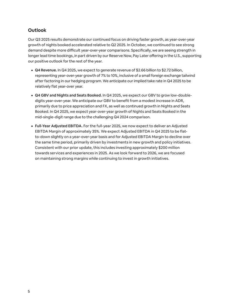 Outlook Our Q3 2025 results demonstrate our continued focus on driving faster growth, as year-over-year growth of nights booked accelerated relative to Q2 2025. In October, we continued to see strong demand despite more difficult year-over-year comparisons. Specifically, we are seeing strength in longer lead time bookings, in part driven by our Reserve Now, Pay Later offering in the U.S., supporting our positive outlook for the rest of the year. ¦ Q4 Revenue. In Q4 2025, we expect to generate revenue of $2.66 billion to $2.72 billion, representing year-over-year growth of 7% to 10%, inclusive of a small foreign exchange tailwind after factoring in our hedging program. We anticipate our implied take rate in Q4 2025 to be relatively flat year-over year. ¦ Q4 GBV and Nights and Seats Booked. In Q4 2025, we expect our GBV to grow low-double- digits year-over-year. We anticipate our GBV to benefit from a modest increase in ADR, primarily due to price appreciation and FX, as well as continued growth in Nights and Seats Booked. In Q4 2025, we expect year-over-year growth of Nights and Seats Booked in the mid-single-digit range due to the challenging Q4 2024 comparison. ¦ Full-Year Adjusted EBITDA. For the full-year 2025, we now expect to deliver an Adjusted EBITDA Margin of approximately 35%. We expect Adjusted EBITDA in Q4 2025 to be flat- to-down slightly on a year-over-year basis and for Adjusted EBITDA Margin to decline over the same time period, primarily driven by investments in new growth and policy initiatives. Consistent with our prior update, this includes investing approximately $200 million towards services and experiences in 2025. As we look forward to 2026, we are focused on maintaining strong margins while continuing to invest in growth initiatives. 5