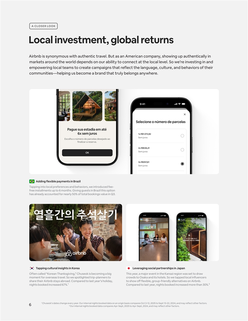 A CLOSER LOOK Local investment, global returns Airbnb is synonymous with authentic travel. But as an American company, showing up authentically in markets around the world depends on our ability to connect at the local level. So we’re investing in and empowering local teams to create campaigns that reflect the language, culture, and behaviors of their communities—helping us become a brand that truly belongs anywhere. Adding flexible payments in Brazil Tapping into local preferences and behaviors, we introduced fee- free installments up to 6 months. Giving guests in Brazil this option has already accounted for nearly 50% of total bookings value in Q3. Tapping cultural insights in Korea Leveraging social partnerships in Japan Often called “Korean Thanksgiving,” Chuseok is becoming a big This year, a major event in the Kansai region was set to draw moment for overseas travel. So we spotlighted trip-planners to crowds to Osaka and its hotels. So we tapped local influencers share their Airbnb stays abroad. Compared to last year’s holiday, to show off flexible, group-friendly alternatives on Airbnb. nights booked increased 67%.1 Compared to last year, nights booked increased more than 30%.2 1 Chuseok’s dates change every year. Our internal nights booked data on an origin basis compares Oct 3-12, 2025 to Sept 13-22, 2024, and may reflect other factors. 6 2 Our internal nights booked data compares Apr-Sept, 2025 to Apr-Sept, 2024, and may reflect other factors.