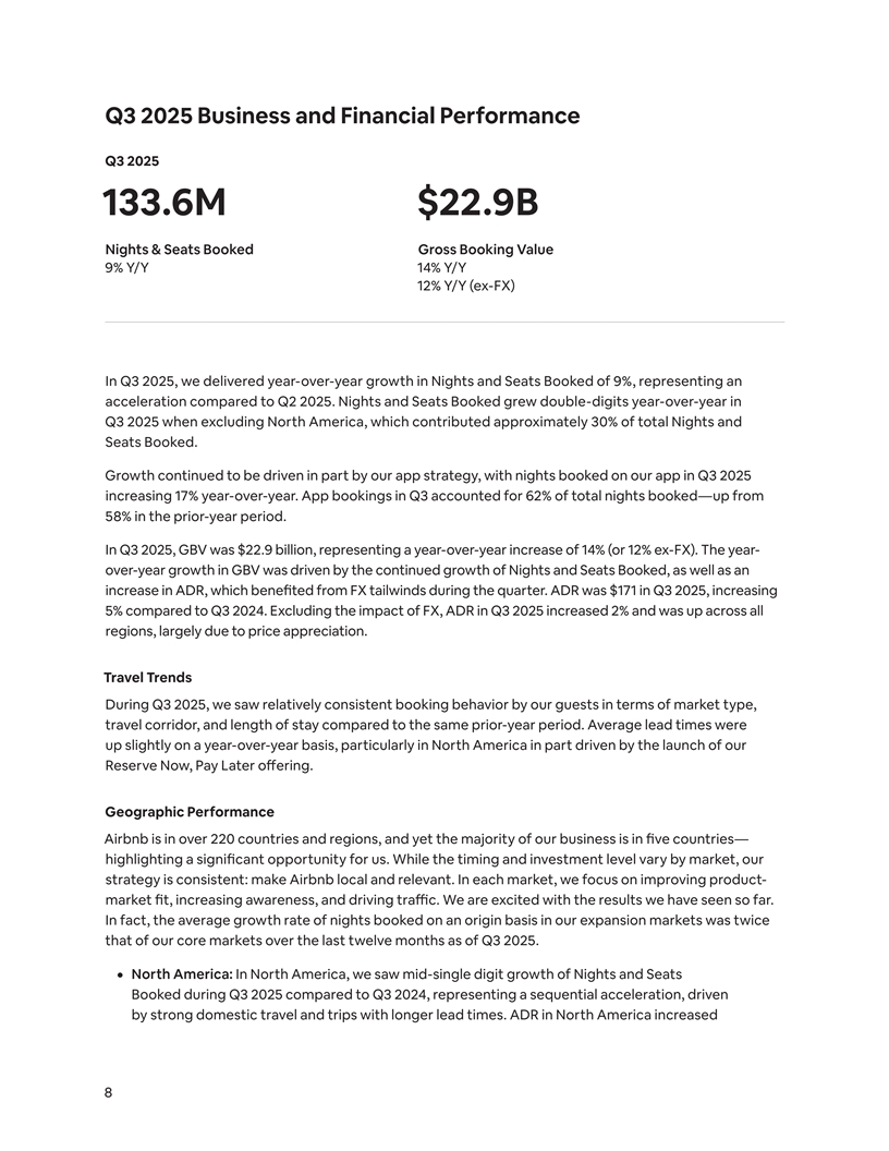 Q3 2025 Business and Financial Performance Q3 2025 133.6M $22.9B Nights & Seats Booked Gross Booking Value 9% Y/Y 14% Y/Y 12% Y/Y (ex-FX) In Q3 2025, we delivered year-over-year growth in Nights and Seats Booked of 9%, representing an acceleration compared to Q2 2025. Nights and Seats Booked grew double-digits year-over-year in Q3 2025 when excluding North America, which contributed approximately 30% of total Nights and Seats Booked. Growth continued to be driven in part by our app strategy, with nights booked on our app in Q3 2025 increasing 17% year-over-year. App bookings in Q3 accounted for 62% of total nights booked—up from 58% in the prior-year period. In Q3 2025, GBV was $22.9 billion, representing a year-over-year increase of 14% (or 12% ex-FX). The year- over-year growth in GBV was driven by the continued growth of Nights and Seats Booked, as well as an increase in ADR, which benefited from FX tailwinds during the quarter. ADR was $171 in Q3 2025, increasing 5% compared to Q3 2024. Excluding the impact of FX, ADR in Q3 2025 increased 2% and was up across all regions, largely due to price appreciation. Travel Trends During Q3 2025, we saw relatively consistent booking behavior by our guests in terms of market type, travel corridor, and length of stay compared to the same prior-year period. Average lead times were up slightly on a year-over-year basis, particularly in North America in part driven by the launch of our Reserve Now, Pay Later offering. Geographic Performance Airbnb is in over 220 countries and regions, and yet the majority of our business is in five countries— highlighting a significant opportunity for us. While the timing and investment level vary by market, our strategy is consistent: make Airbnb local and relevant. In each market, we focus on improving product- market fit, increasing awareness, and driving traffic. We are excited with the results we have seen so far. In fact, the average growth rate of nights booked on an origin basis in our expansion markets was twice that of our core markets over the last twelve months as of Q3 2025. ¦ North America: In North America, we saw mid-single digit growth of Nights and Seats Booked during Q3 2025 compared to Q3 2024, representing a sequential acceleration, driven by strong domestic travel and trips with longer lead times. ADR in North America increased 8