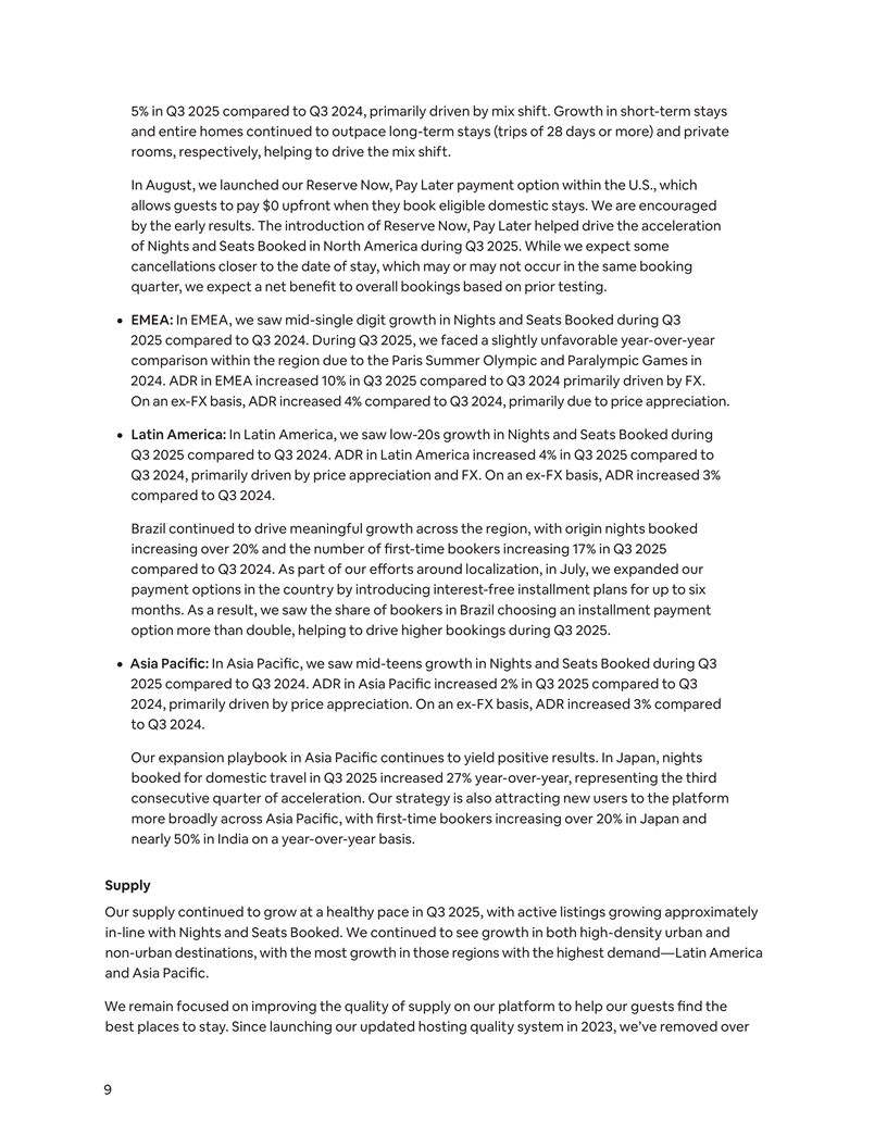 5% in Q3 2025 compared to Q3 2024, primarily driven by mix shift. Growth in short-term stays and entire homes continued to outpace long-term stays (trips of 28 days or more) and private rooms, respectively, helping to drive the mix shift. In August, we launched our Reserve Now, Pay Later payment option within the U.S., which allows guests to pay $0 upfront when they book eligible domestic stays. We are encouraged by the early results. The introduction of Reserve Now, Pay Later helped drive the acceleration of Nights and Seats Booked in North America during Q3 2025. While we expect some cancellations closer to the date of stay, which may or may not occur in the same booking quarter, we expect a net benefit to overall bookings based on prior testing. ¦ EMEA: In EMEA, we saw mid-single digit growth in Nights and Seats Booked during Q3 2025 compared to Q3 2024. During Q3 2025, we faced a slightly unfavorable year-over-year comparison within the region due to the Paris Summer Olympic and Paralympic Games in 2024. ADR in EMEA increased 10% in Q3 2025 compared to Q3 2024 primarily driven by FX. On an ex-FX basis, ADR increased 4% compared to Q3 2024, primarily due to price appreciation. ¦ Latin America: In Latin America, we saw low-20s growth in Nights and Seats Booked during Q3 2025 compared to Q3 2024. ADR in Latin America increased 4% in Q3 2025 compared to Q3 2024, primarily driven by price appreciation and FX. On an ex-FX basis, ADR increased 3% compared to Q3 2024. Brazil continued to drive meaningful growth across the region, with origin nights booked increasing over 20% and the number of first-time bookers increasing 17% in Q3 2025 compared to Q3 2024. As part of our eo ff rts around localization, in July, we expanded our payment options in the country by introducing interest-free installment plans for up to six months. As a result, we saw the share of bookers in Brazil choosing an installment payment option more than double, helping to drive higher bookings during Q3 2025. ¦ Asia Pacific: In Asia Pacific, we saw mid-teens growth in Nights and Seats Booked during Q3 2025 compared to Q3 2024. ADR in Asia Pacific increased 2% in Q3 2025 compared to Q3 2024, primarily driven by price appreciation. On an ex-FX basis, ADR increased 3% compared to Q3 2024. Our expansion playbook in Asia Pacific continues to yield positive results. In Japan, nights booked for domestic travel in Q3 2025 increased 27% year-over-year, representing the third consecutive quarter of acceleration. Our strategy is also attracting new users to the platform more broadly across Asia Pacific, with first-time bookers increasing over 20% in Japan and nearly 50% in India on a year-over-year basis. Supply Our supply continued to grow at a healthy pace in Q3 2025, with active listings growing approximately in-line with Nights and Seats Booked. We continued to see growth in both high-density urban and non-urban destinations, with the most growth in those regions with the highest demand—Latin America and Asia Pacific. We remain focused on improving the quality of supply on our platform to help our guests find the best places to stay. Since launching our updated hosting quality system in 2023, we’ve removed over 9