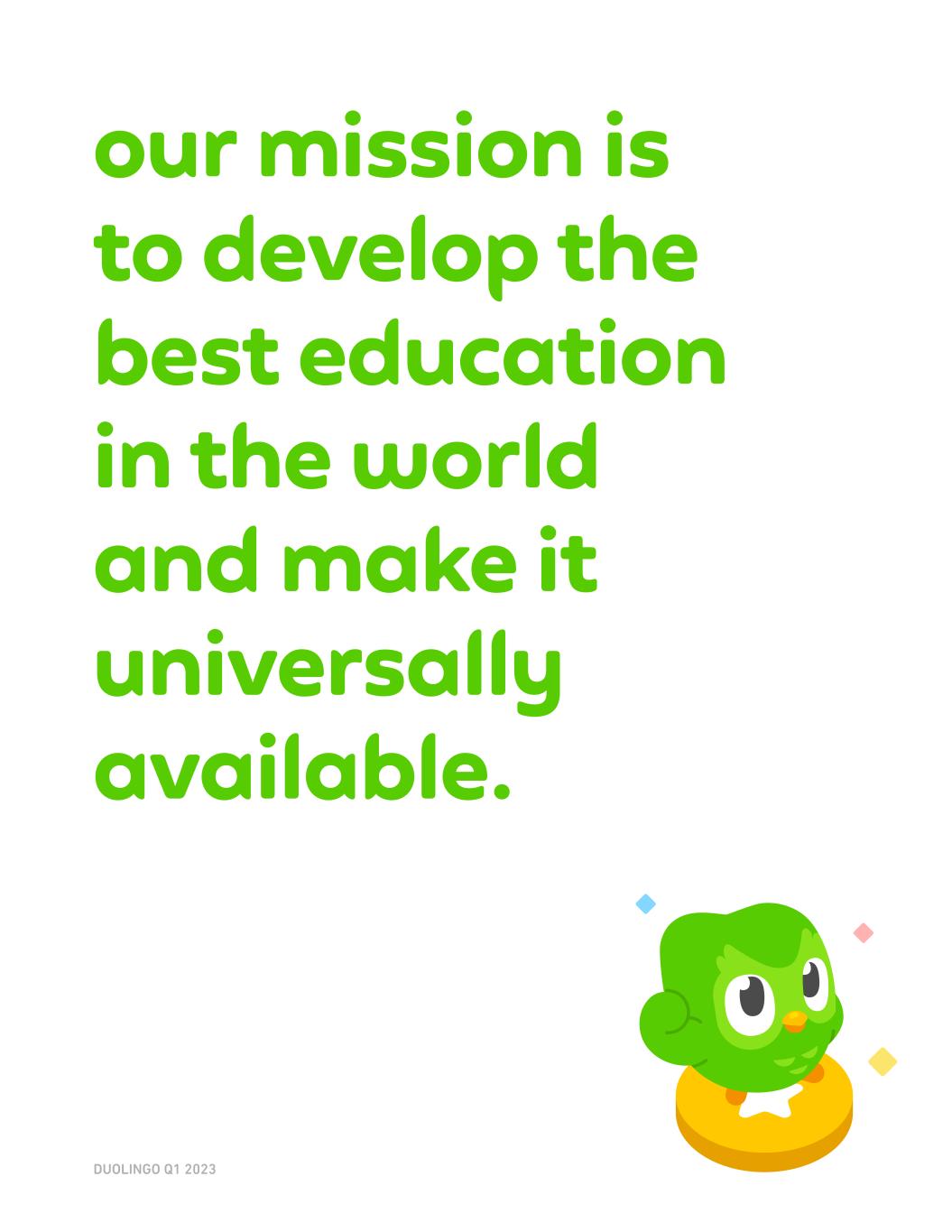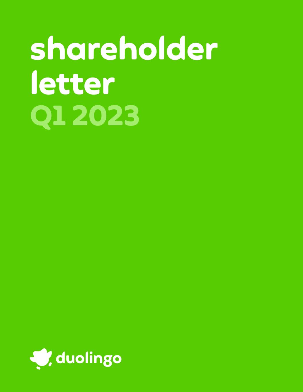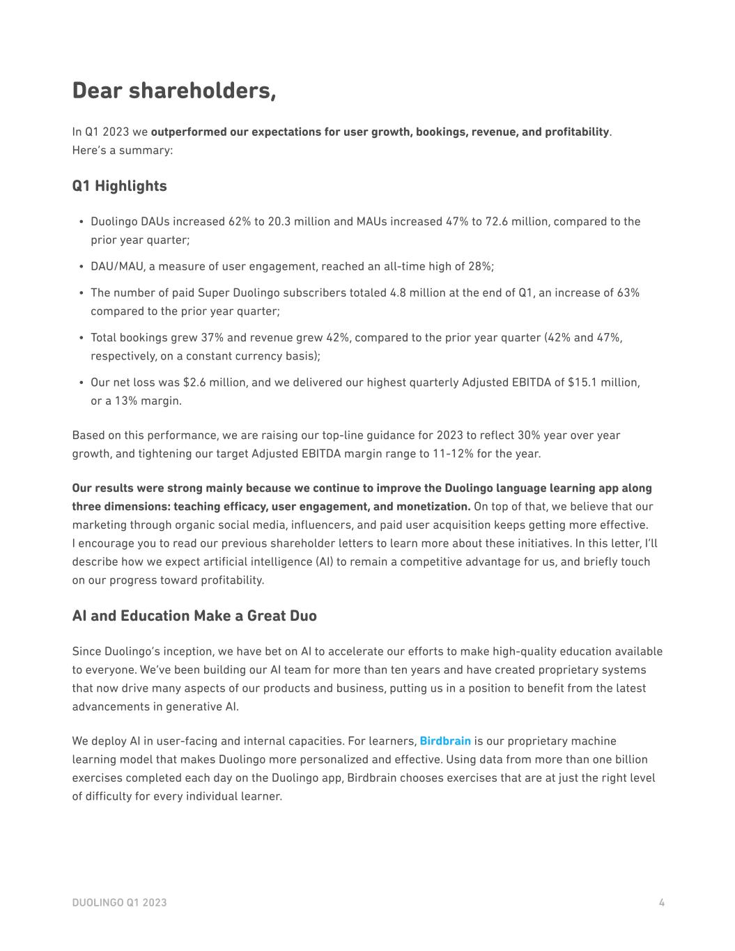 DUOLINGO Q1 2023 4 Dear shareholders, In Q1 2023 we outperformed our expectations for user growth, bookings, revenue, and profitability.