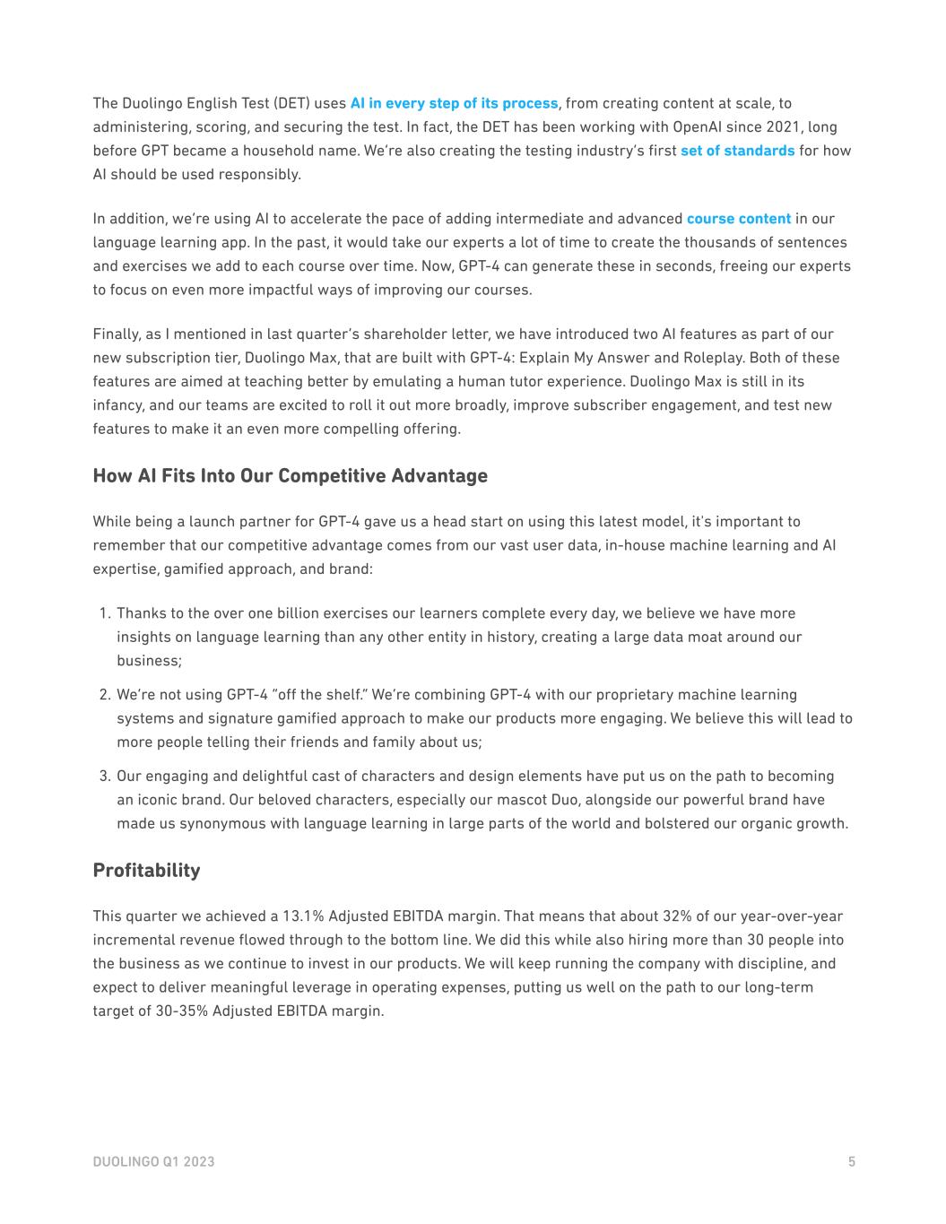 DUOLINGO Q1 2023 5 The Duolingo English Test (DET) uses , from creating content at scale, to administering, scoring, and securing the test. In fact, the DET has been working with OpenAI since 2021, long before GPT became a household name. We’re also creating the testing industry’s first for how AI should be used responsibly. In addition, we’re using AI to accelerate the pace of adding intermediate and advanced in our language learning app. In the past, it would take our experts a lot of time to create the thousands of sentences and exercises we add to each course over time. Now, GPT-4 can generate these in seconds, freeing our experts to focus on even more impactful ways of improving our courses.  Finally, as I mentioned in last quarter’s shareholder letter, we have introduced two AI features as part of our new subscription tier, Duolingo Max, that are built with GPT-4: Explain My Answer and Roleplay. Both of these features are aimed at teaching better by emulating a human tutor experience. Duolingo Max is still in its infancy, and our teams are excited to roll it out more broadly, improve subscriber engagement, and test new features to make it an even more compelling offering. AI in every step of its process set of standards course content How AI Fits Into Our Competitive Advantage While being a launch partner for GPT-4 gave us a head start on using this latest model, it's important to remember that our competitive advantage comes from our vast user data, in-house machine learning and AI expertise, gamified approach, and brand‚ yw Thanks to the over one billion exercises our learners complete every day, we believe we have more insights on language learning than any other entity in history, creating a large data moat around our businessƒ sw We’re not using GPT-4 “off the shelf.” We’re combining GPT-4 with our proprietary machine learning systems and signature gamified approach to make our products more engaging. We believe this will lead to more people telling their friends and family about usƒ “w Our engaging and delightful cast of characters and design elements have put us on the path to becoming an iconic brand. Our beloved characters, especially our mascot Duo, alongside our powerful brand have made us synonymous with language learning in large parts of the world and bolstered our organic growth. Profitability This quarter we achieved a 13.1% Adjusted EBITDA margin. That means that about 32% of our year-over-year incremental revenue flowed through to the bottom line. We did this while also hiring more than 30 people into the business as we continue to invest in our products. We will keep running the company with discipline, and expect to deliver meaningful leverage in operating expenses, putting us well on the path to our long-term target of 30-35% Adjusted EBITDA margin.