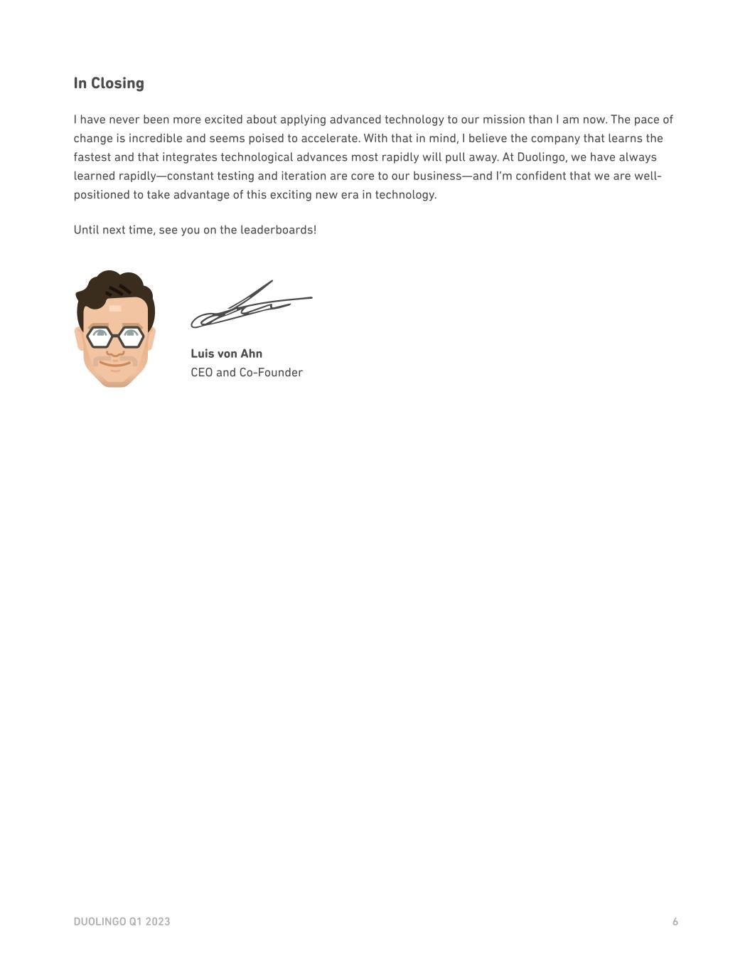 DUOLINGO Q1 2023 6 In Closing I have never been more excited about applying advanced technology to our mission than I am now. The pace of change is incredible and seems poised to accelerate. With that in mind, I believe the company that learns the fastest and that integrates technological advances most rapidly will pull away. At Duolingo, we have always learned rapidly—constant testing and iteration are core to our business—and I’m confident that we are well- positioned to take advantage of this exciting new era in technology.  Until next time, see you on the leaderboards! Luis von Ahn CEO and Co-Founder